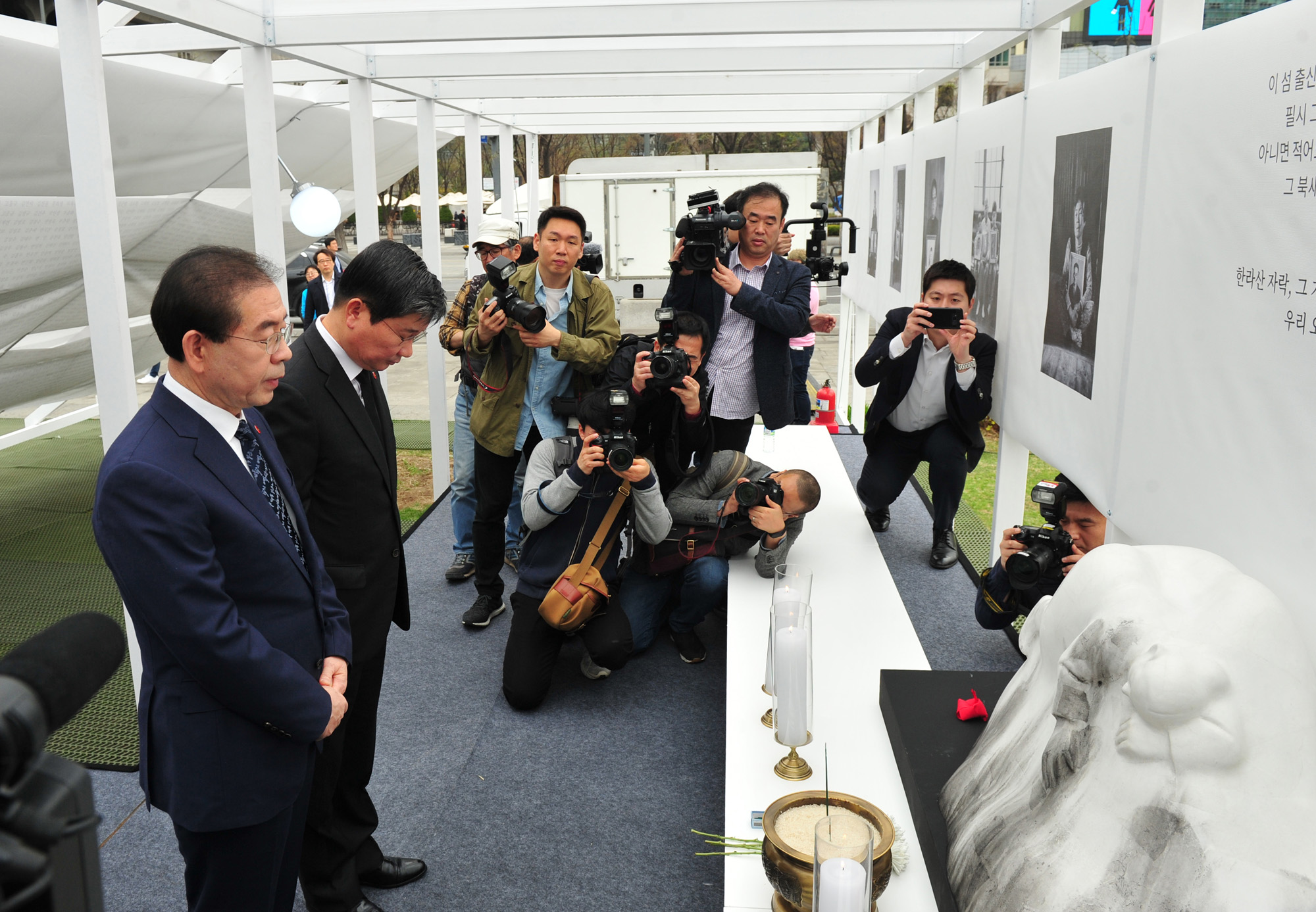 박원순 서울시장이 3일 서울 종로구 광화문광장에 마련된 제주 4 ·3 광화문 추념식에서 제주 4 ·3 사건의 희생자들을 기리며 추모 묵념을 하고 있다. 서울시 제공