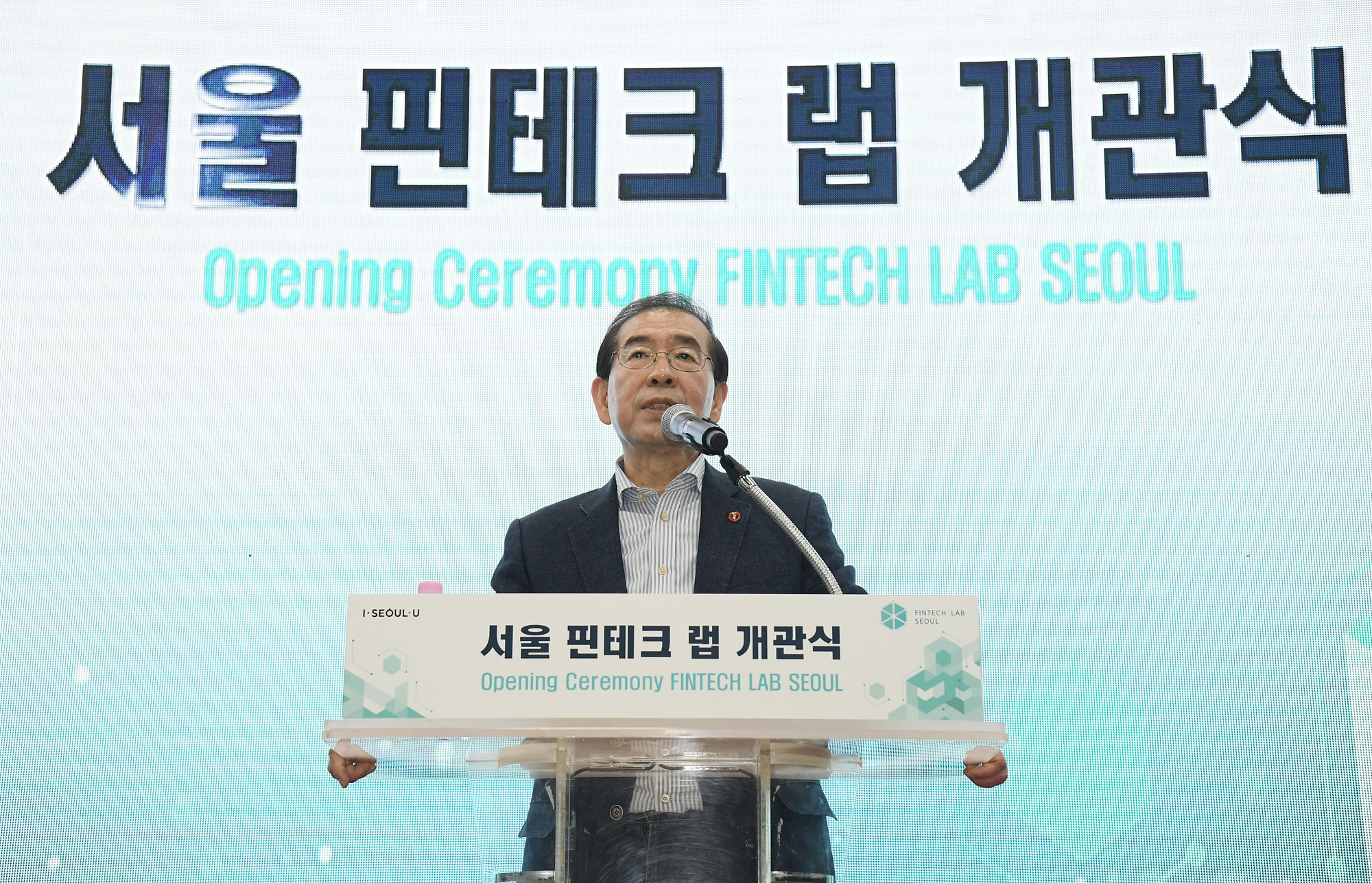 박원순 서울시장이 3일 오후 서울 마포구 서울창업허브 내 서울핀테크 랩 개관식에서 인사말을 하고 있다. 서울시 제공