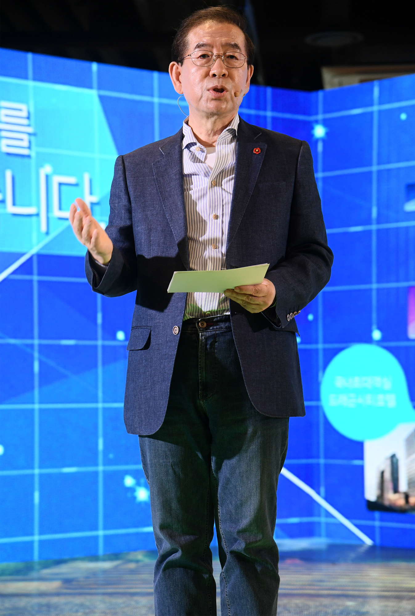 박원순 서울시장이 3일 오후 서울 용산구 원효전자상가에서 열린 '디지털 메이커 시티 용산 Y밸리(Y-Valley) 혁신플랫폼 선포식'에서 용산 Y밸리 개발 계획에 대해 설명하고 있다. 서울시 제공