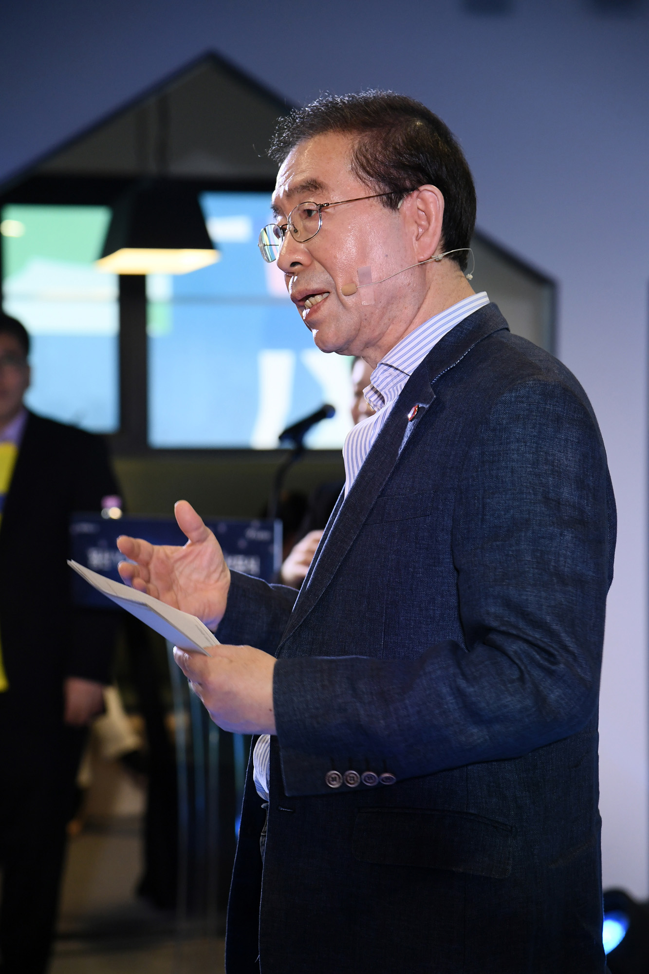 박원순 서울시장이 3일 오후 서울 용산구 원효전자상가에서 열린 '디지털 메이커 시티 용산 Y밸리(Y-Valley) 혁신플랫폼 선포식'에서 용산 Y밸리 개발 계획에 대해 설명하고 있다. 서울시 제공