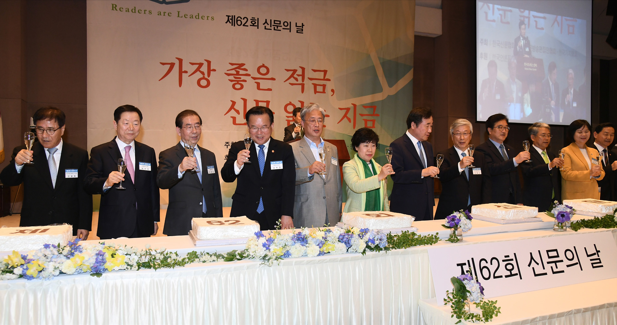 | 사진설명 | 5일 오후 서울 중구 프레스센터에서 제62회 신문의 날 기념식이 열린 가운데, 이날 행사에는 이낙연 국무총리, 도종환 문화체육관광부장관, 정규성 한국기자협회장, 민병욱 한국언론진흥재단 이사장, 박원순 서울시장, 김부겸 행정안전부장관, 조배숙 민주평화당대표, 이병규 한국신문협회 회장, 우원식 더불어민주당원내대표, 김동철 바른미래당원내대표, 이정미 정의당대표 등이 참석했다. 서울시 제공 |