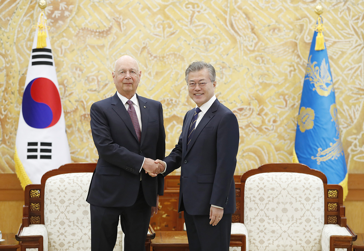 문재인 대통령이 11일 오전 청와대 접견실에서 클라우스 슈밥 세계경제포럼(WEF) 회장을 접견 하고 있다.