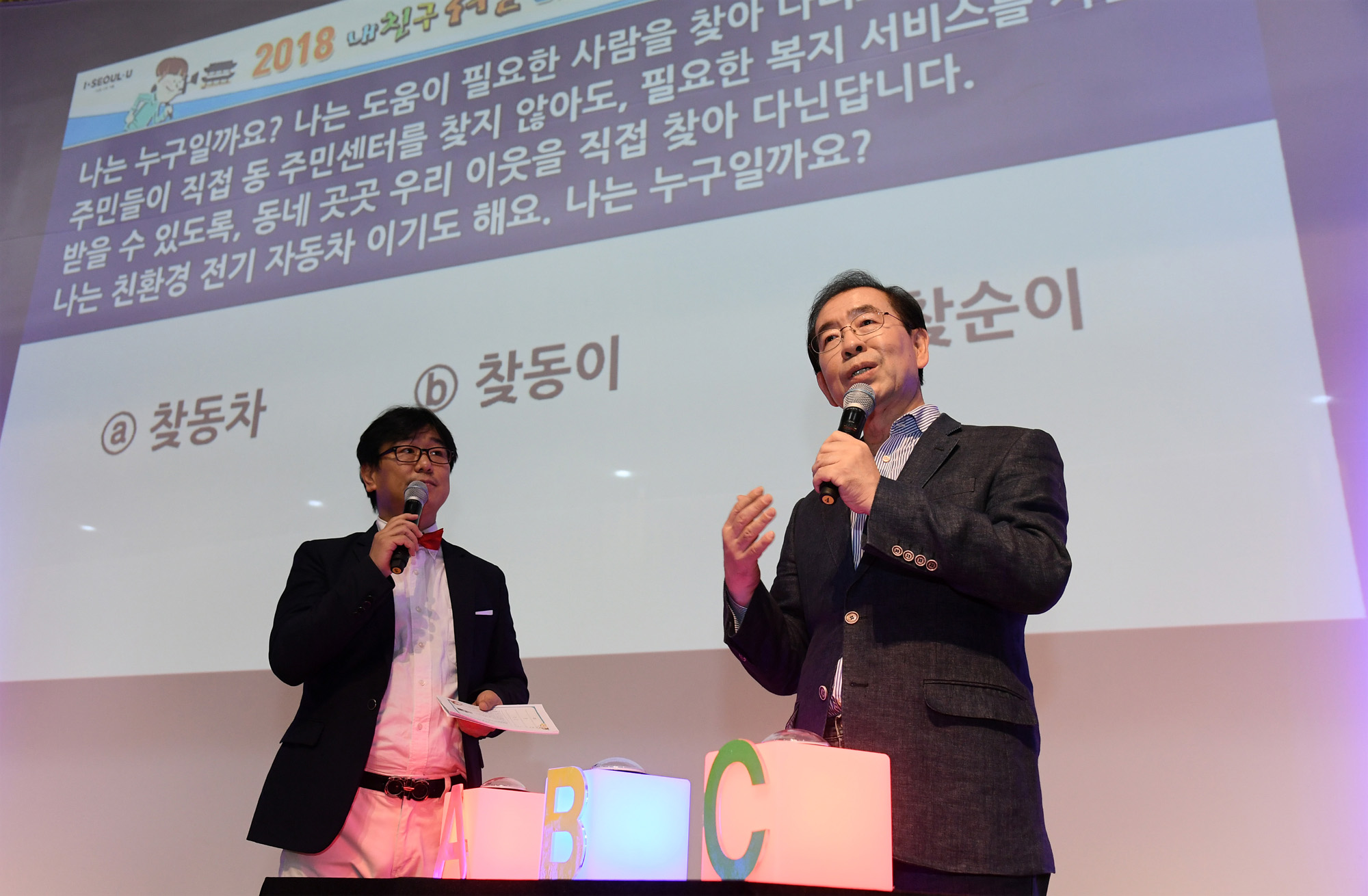 '내친구서울 2018 어린이기자 위촉식'이 7일 오후 서울 중구 서울시청 다목적홀에서 열린 가운데 박원순 서울시장이 무대위에서 축하 인사를 하고 있다. 서울시 제공