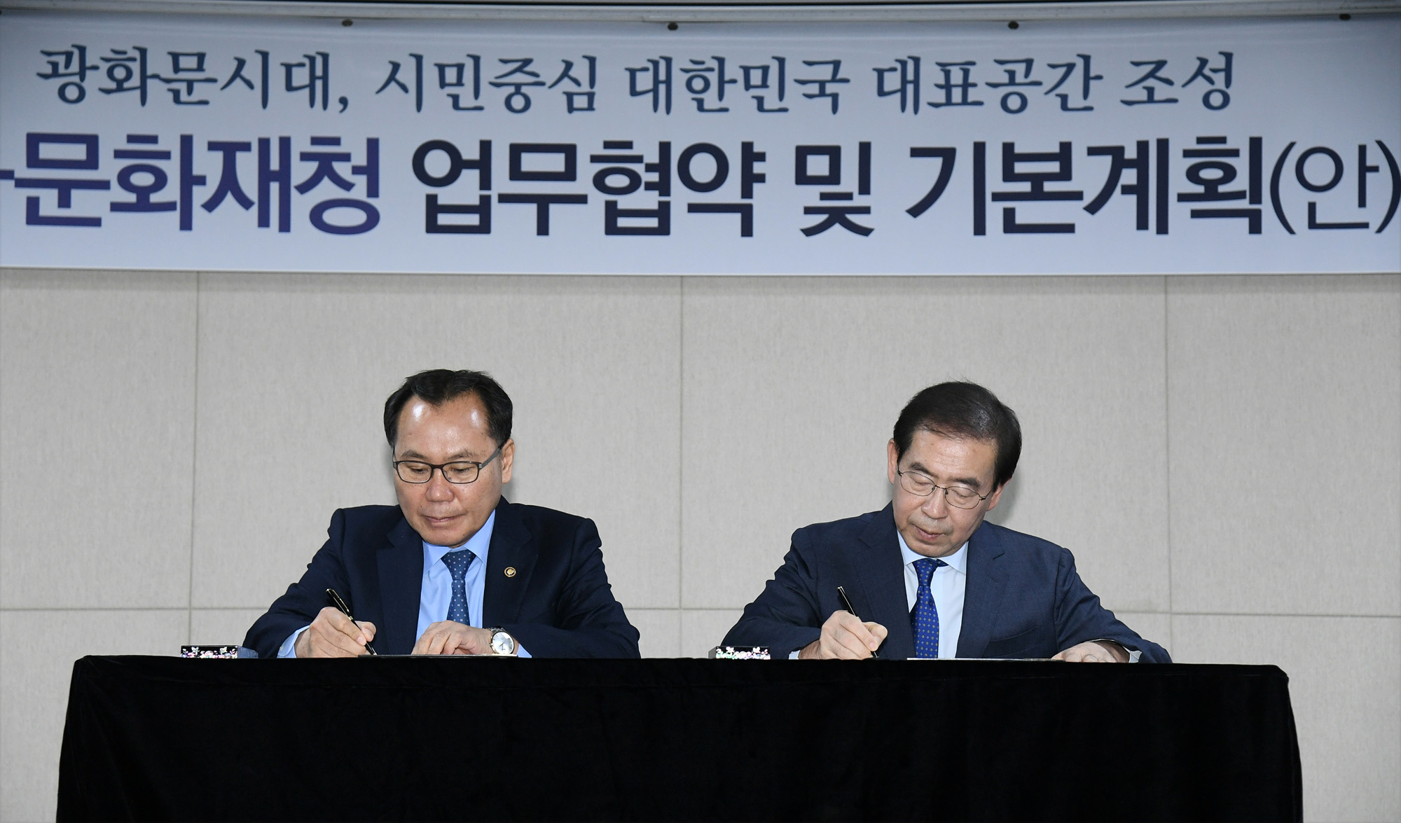 박원순 서울시장이 10일 오후 서울 종로구 고궁박물관에서 열린 ‘새로운 광화문광장 조성 서울시-문화재청 업무협약 및 기본계획(안) 발표’ 업무협약식 조성안을 발표하고 있다. 서울시 제공