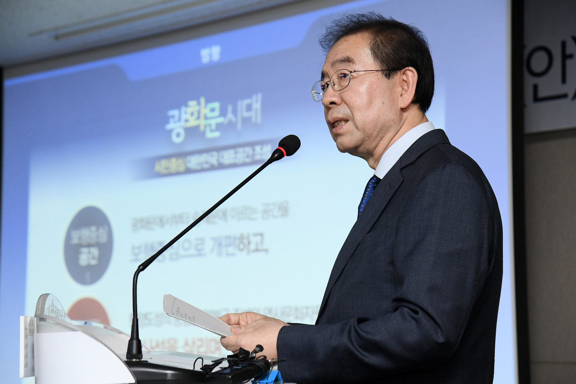 박원순 서울시장이 10일 오후 서울 종로구 고궁박물관에서 열린 ‘새로운 광화문광장 조성 서울시-문화재청 업무협약 및 기본계획(안) 발표’ 업무협약식 조성안을 발표하고 있다. 서울시 제공