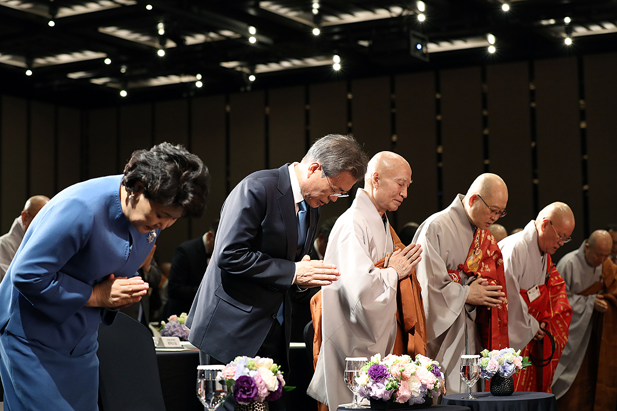 문재인 대통령과 부인 김정숙 여사가 17일 오후 서울 강남구 그랜드 인터컨티넨탈 서울파르나스 그랜드볼룸에서 열린 한반도 안정과 평화를 위한 기원 법회에서 평화를 기원하는 합장을 하고 있다