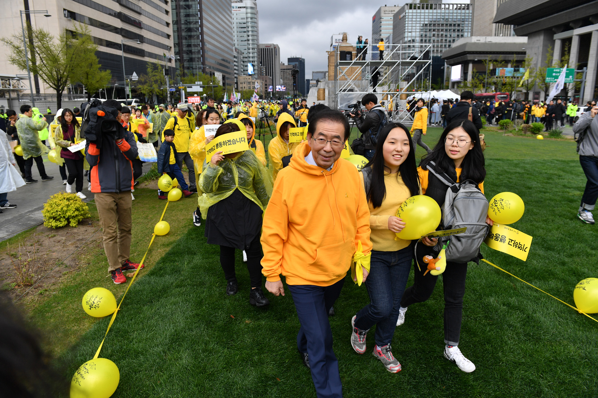 14일 오후 4시 서울 광화문 광장에서 열린 노란 리본 만들기 플래시몹 행사에 박원순 서울시장이 참석하고 있다. 서울시 제공