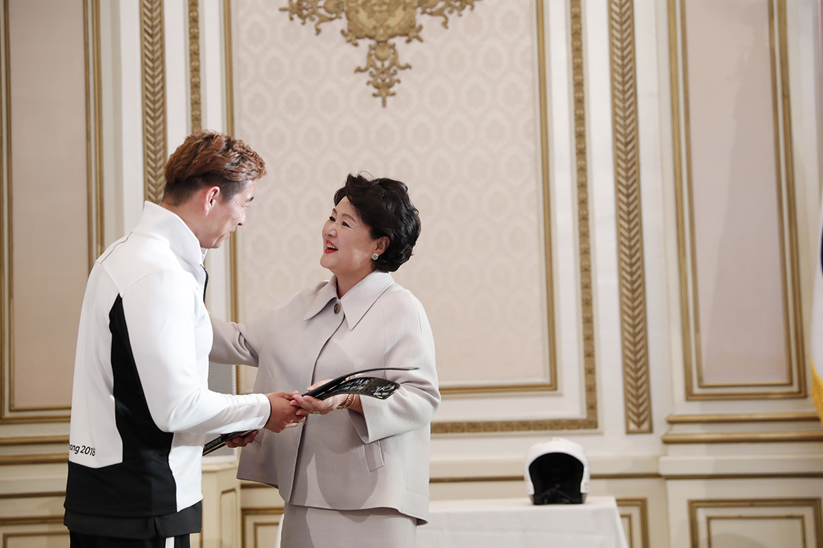 문재인 대통령 부인 김정숙 여사가 20일 오후 청와대 영빈관에서 열린 2018 평창동계패럴림픽 선수단 격려 오찬에서 아이스하키 대표단 한민수 선수로부터 대표팀 사인이 담긴 하키스틱을 선물 받고 있다.