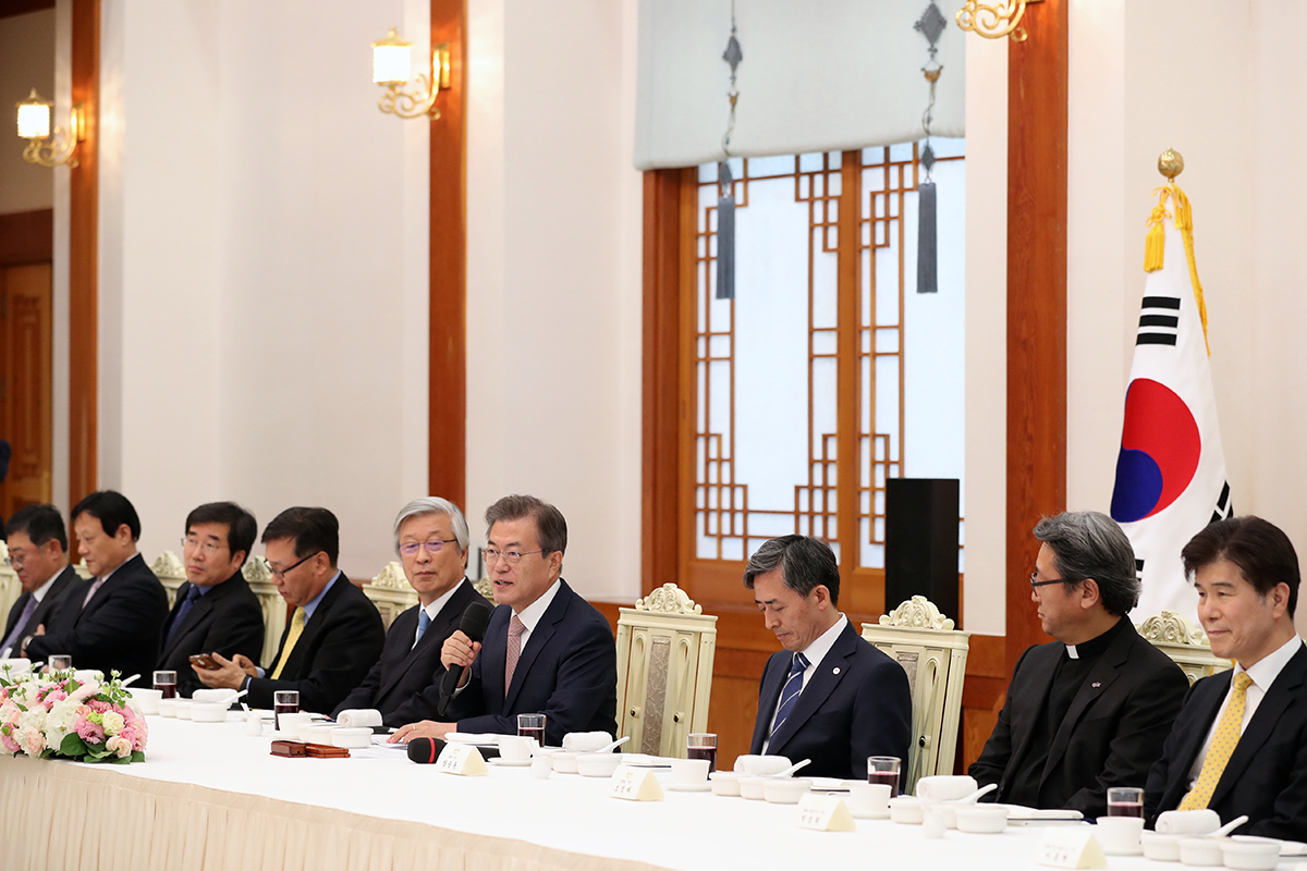문재인 대통령이 19일 청와대에서 열린 언론사 사장단 오찬 간담회에서 인사말을 하고 있다.