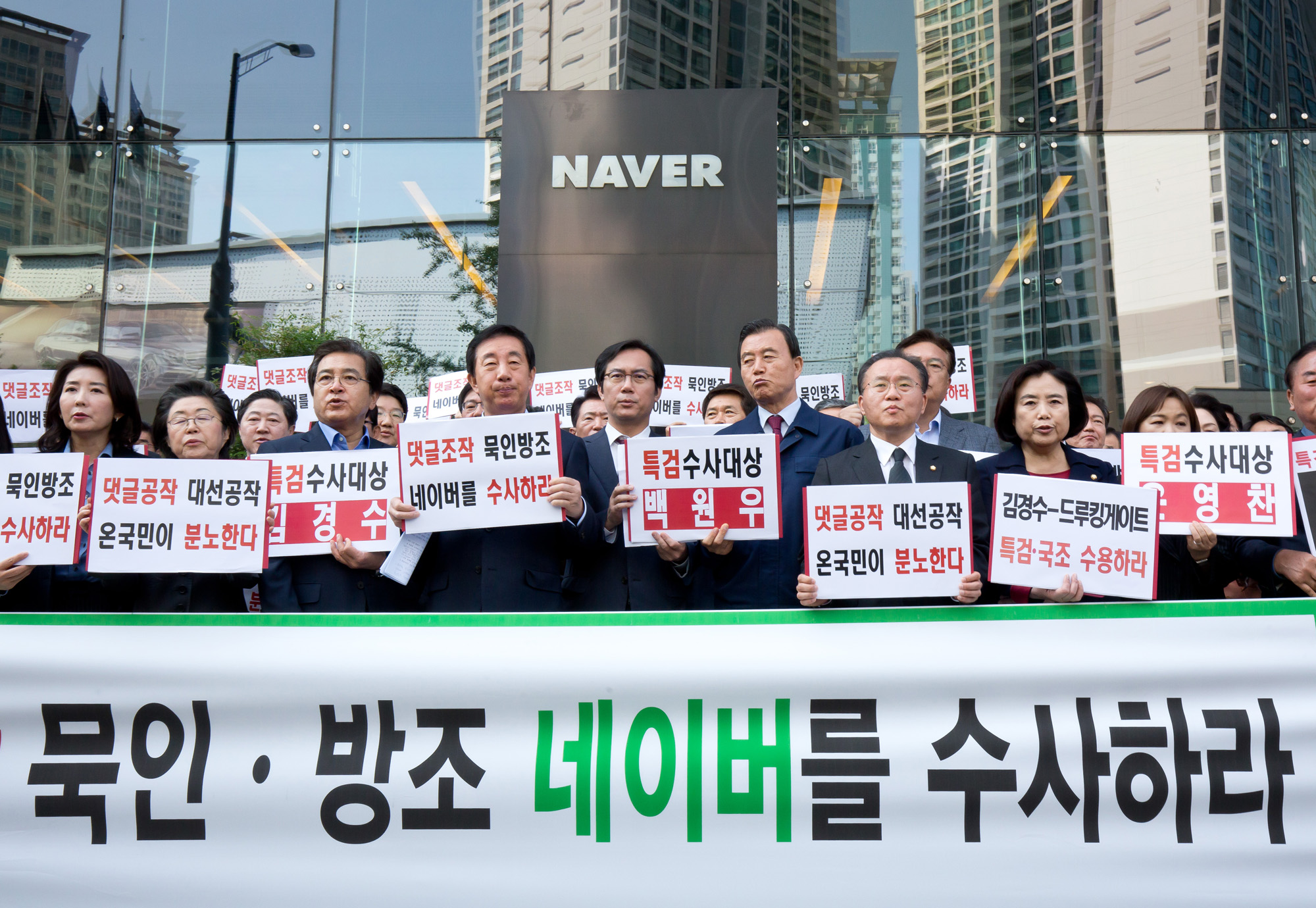 [eoimage=성남](이오이미지) 임준선기자 = 자유한국당 김성태 원내대표 등 의원들이 25일 오전 경기도 성남시 네이버 본사 앞에서 드루킹 댓글조작 관련 비상 의원총회를 하고 있다