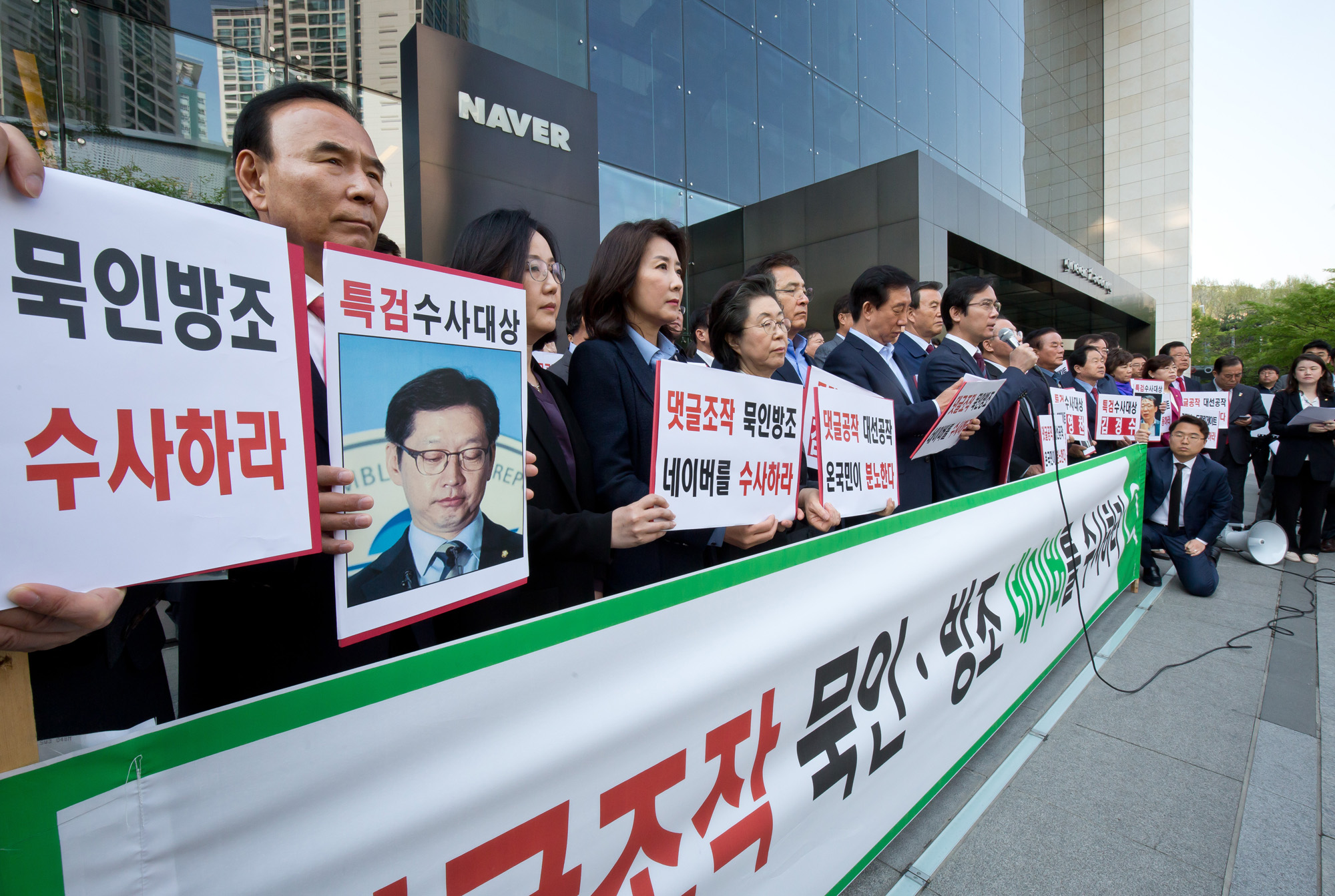 [eoimage=성남](이오이미지) 임준선기자 = 자유한국당 김성태 원내대표 등 의원들이 25일 오전 경기도 성남시 네이버 본사 앞에서 드루킹 댓글조작 관련 비상 의원총회를 하고 있다
