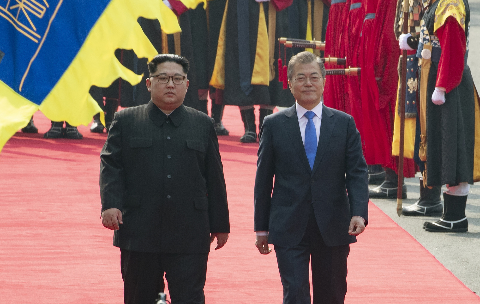 문재인 대통령과 김정은 국무위원장이 27일 오전 판문점 자유의집앞에서 전통의장대의 호위를 받으며 공식환영식장으로 이동하고 있다. 2018.4.27 한국공동사진기자단