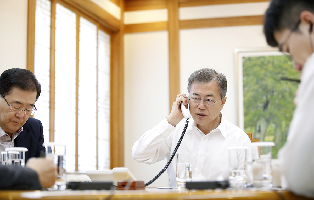 문재인 대통령이 지난 28일 아베 신조 일본 총리와의 통화에서 김정은 북한 국무위원장이 일본과 대화할 용의가 있음을 전달 하고 있다.