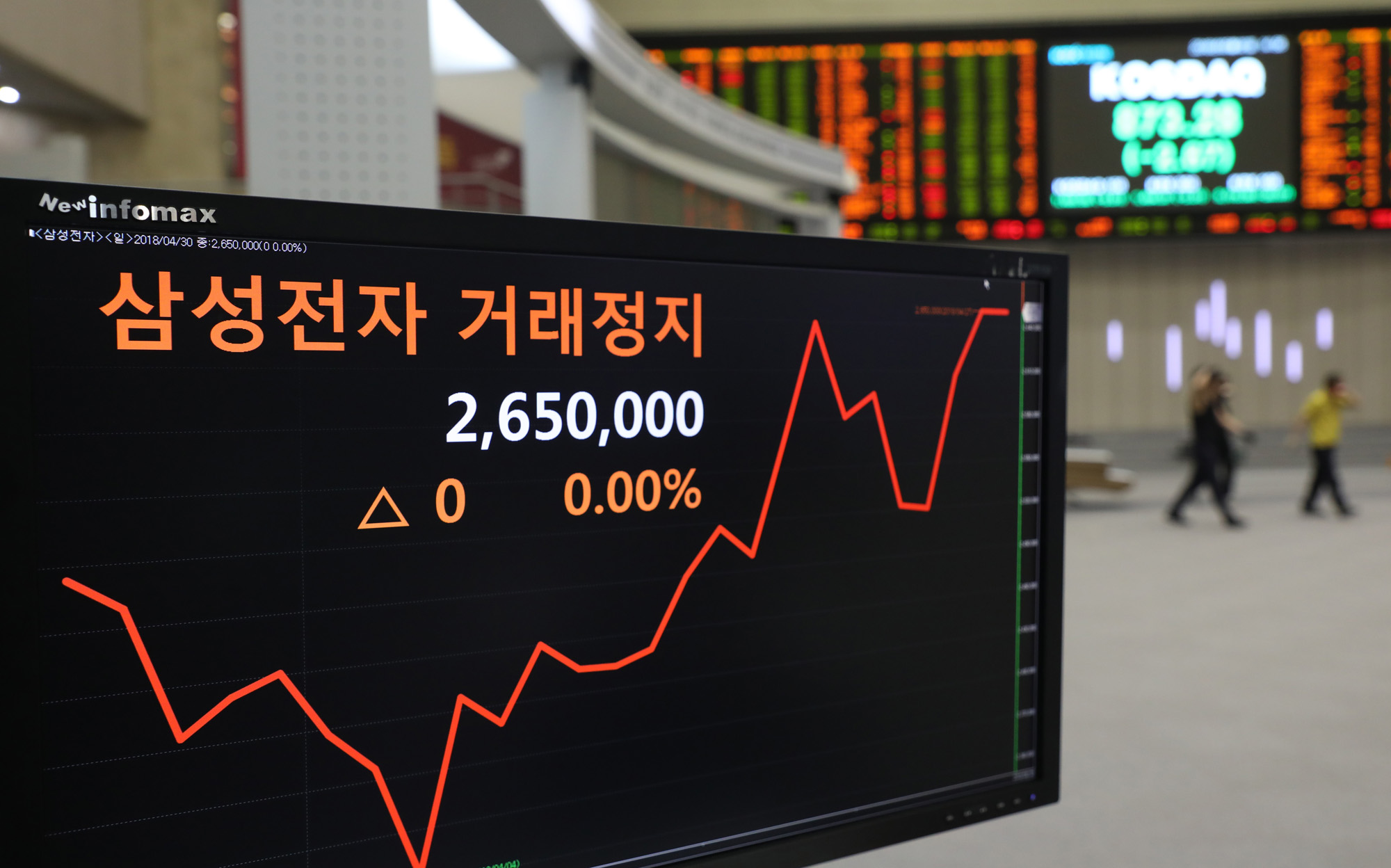 [eoimage=서울] 박은숙 기자 = 삼성전자가 액면분할로 매매거래가 정지된 2일 오후 서울 여의도 한국거래소 시세단말기에 거래정지 표시가 나타나고 있다. 5월4일 삼성전자 주식이 주당 5만3,000원대에서 거래가 재개된다. 2018. 5.02.eomaster@eoimage.com