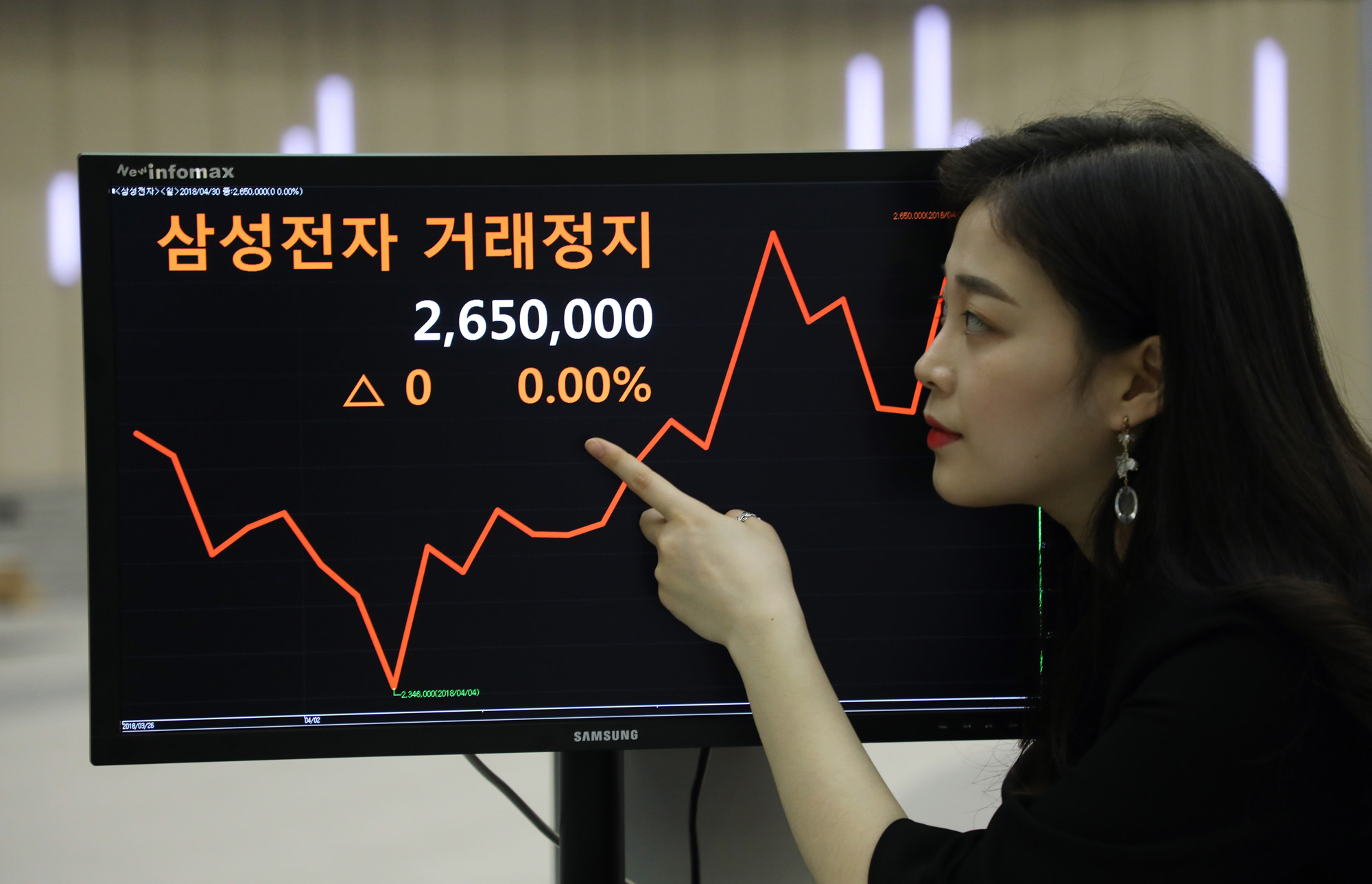 [eoimage=서울] 박은숙 기자 = 삼성전자가 액면분할로 매매거래가 정지된 2일 오후 서울 여의도 한국거래소 직원들이 시세단말기에 거래정지를 확인하고 있다. 5월4일 삼성전자 주식이 주당 5만3,000원대에서 거래가 재개된다. 2018. 5.02.eomaster@eoimage.com