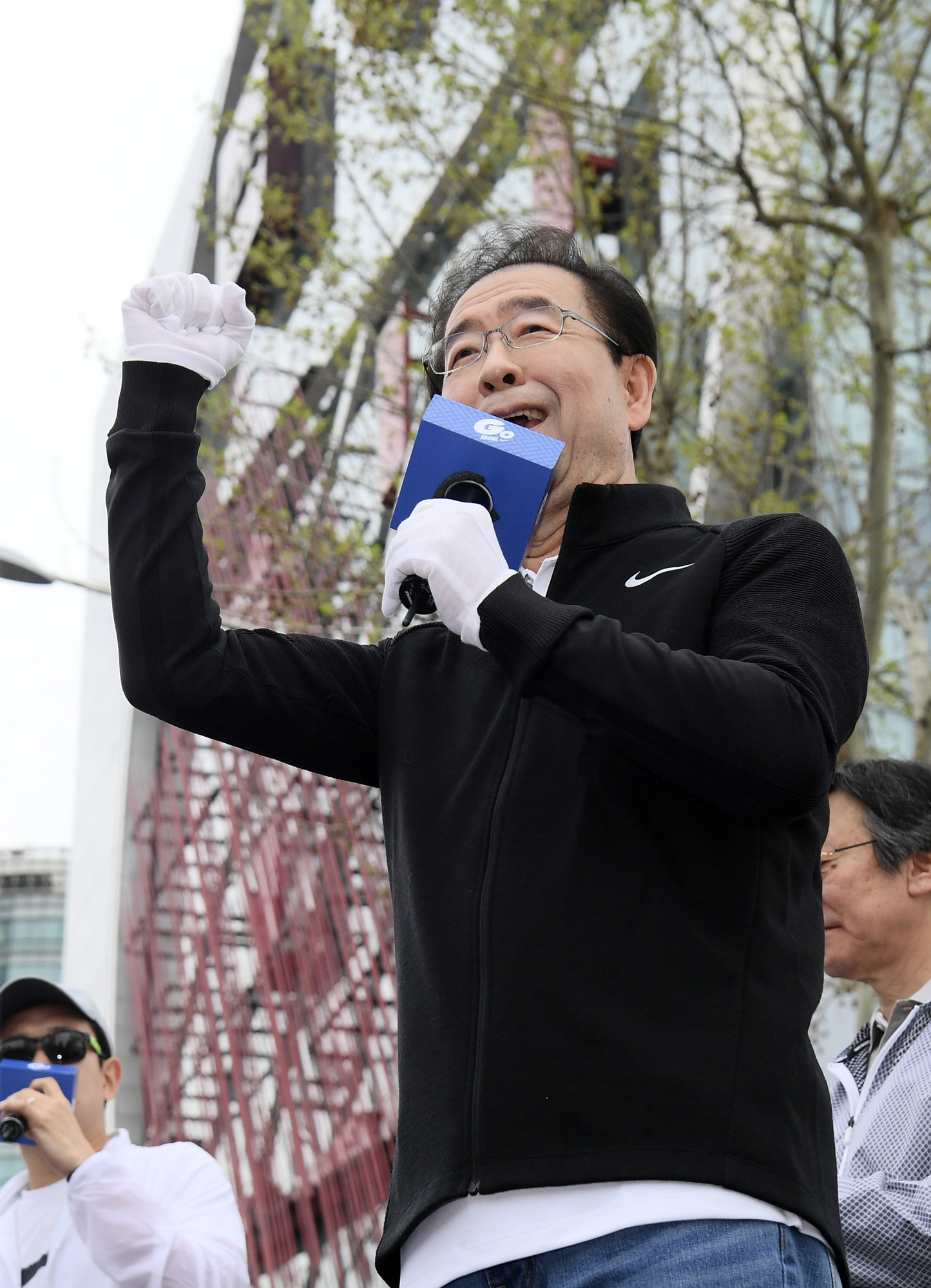 박원순 서울시장이 22일 오전 서울 강남구 코엑스 일대에서 열린 '나이키 고 서울' 시티레이스-우먼스 하프마라톤 대회에서 참가자들과 인사하고 있다. 서울시 제공