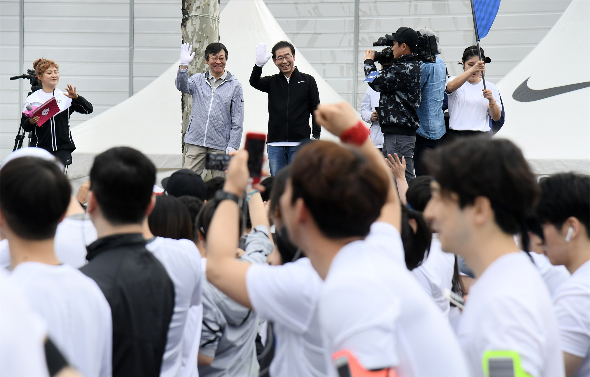 박원순 서울시장이 22일 오전 서울 강남구 코엑스 일대에서 열린 '나이키 고 서울' 시티레이스-우먼스 하프마라톤 대회에서 참가자들과 인사하고 있다. 서울시 제공