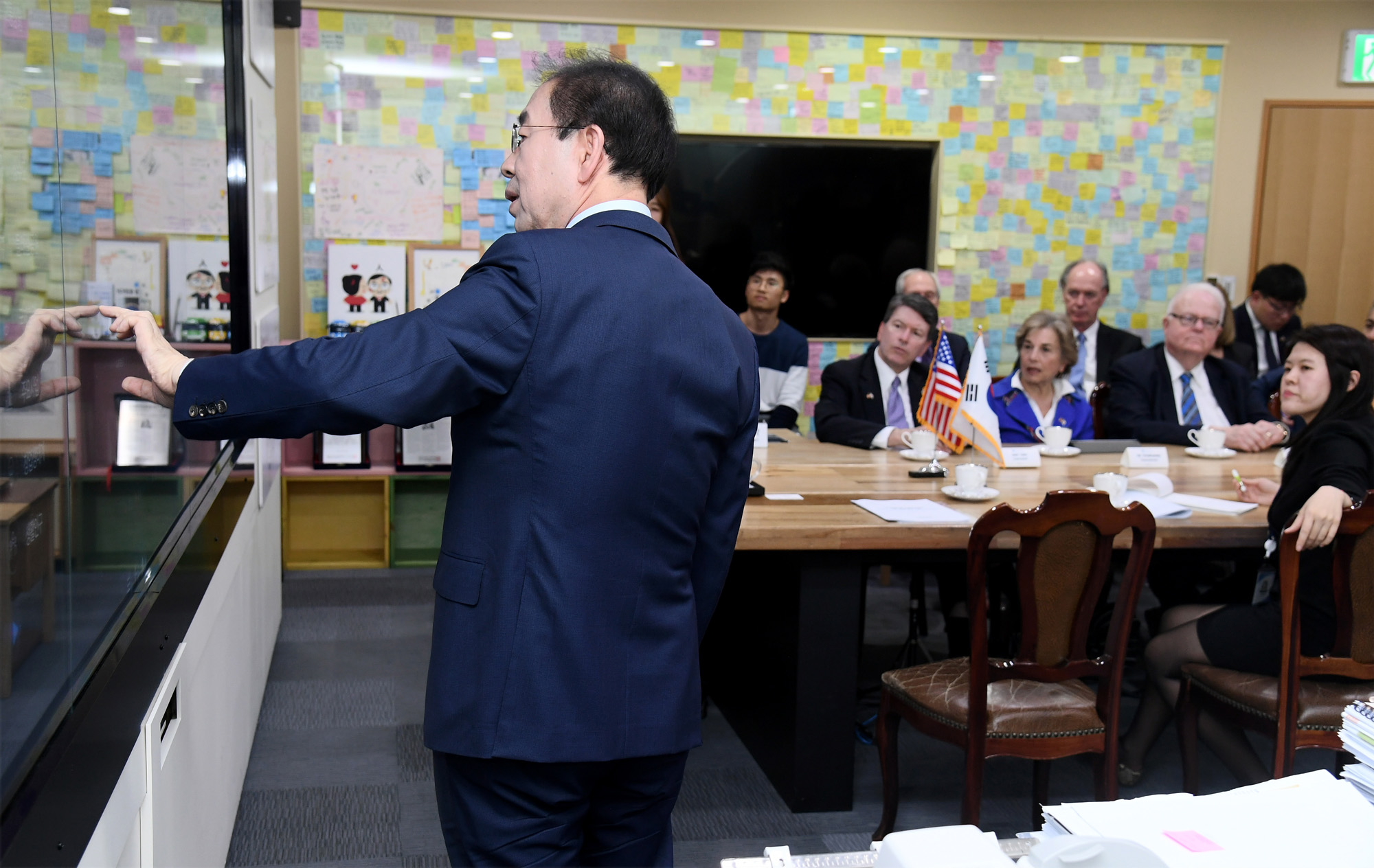 박원순 서울시장이 4월 30일 시장실에서 서울을 방문한 미국의회 내 한국연구모임(CSGK) 소속 연방하원의원들과 면담을 하고 있다. 서울시 제공