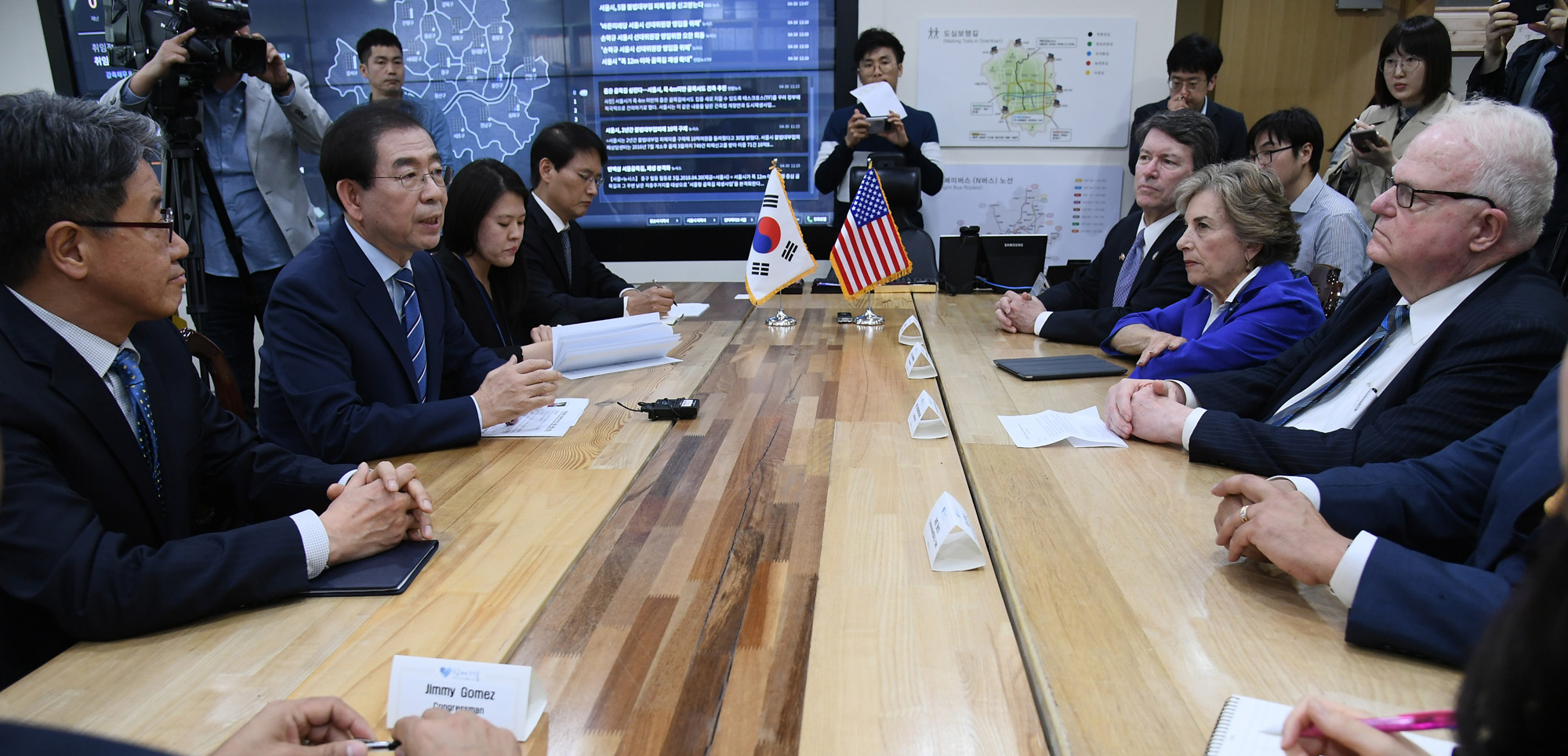 박원순 서울시장이 4월 30일 시장실에서 서울을 방문한 미국의회 내 한국연구모임(CSGK) 소속 연방하원의원들과 면담을 하고 있다. 서울시 제공