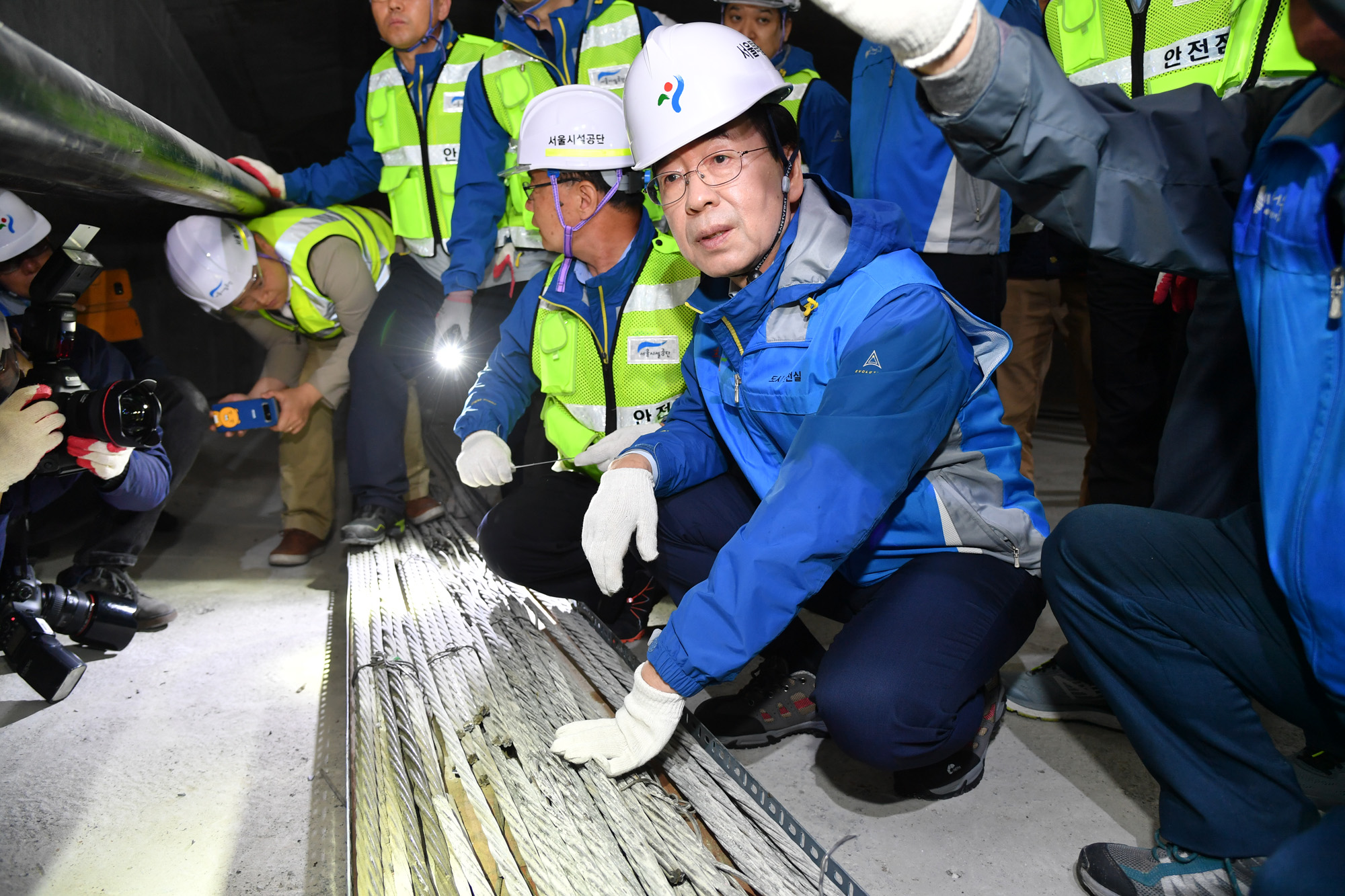 박원순(왼쪽) 서울시장이 3일 오전 서울 정릉천고가교를 찾아 손상텐덴 복구 및 유지관리에 관한 보고를 받으며 현장점검을 하고 있다. 정릉천고가교는 지난 2016년 해빙기 안전점검 중 텐던(15개 강연선이 묶인 하나의 케이블)이 끊어지는 내부 결함이 발견돼 취약 부분 보수·보강 공사가 이뤄지고 있다. 서울시 제공 |