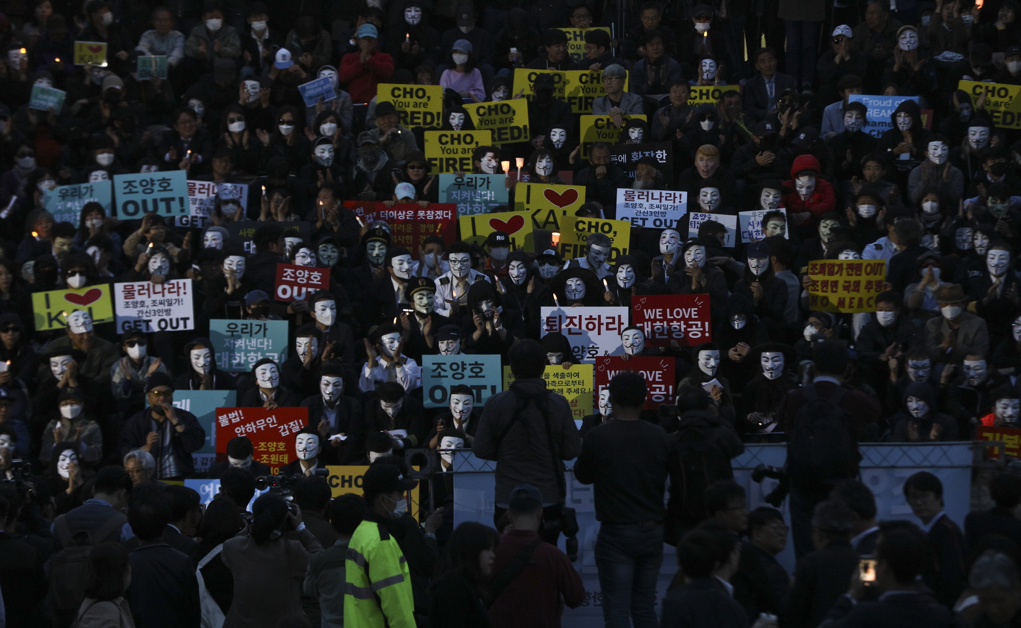 [서울=eoimage] 고성준 기자 = 대한항공 직원들과 시민들이 4일 저녁 서울 종로구 세종문화회관 계단에서 '조양호 일가 퇴진과 갑질근절을 위한 촛불집회'에 참석하고 있다. 2018.5.4