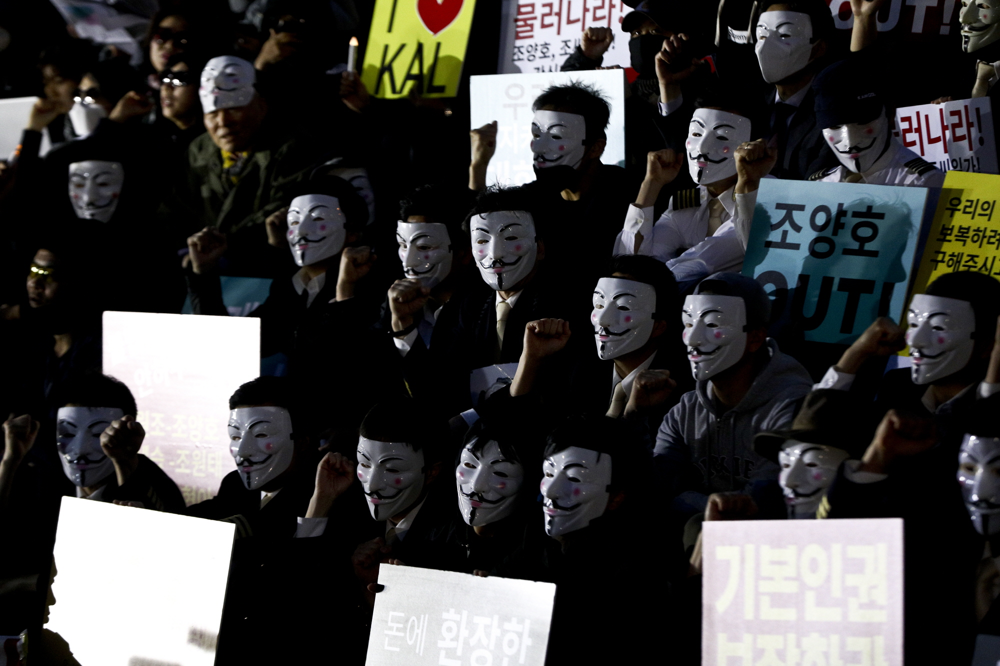 [서울=eoimage] 고성준 기자 = 대한항공 직원들과 시민들이 4일 저녁 서울 종로구 세종문화회관 계단에서 '조양호 일가 퇴진과 갑질근절을 위한 촛불집회'에 참석하고 있다. 2018.5.4