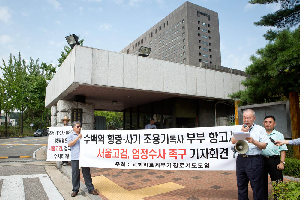 [서울=eoimage] 임준선 기자 =22일 오전 서울 중앙지방검찰청 앞에서 여의도 순복음 교회 바로 세우기 장로 기도 모임 일동이 조용기 목사 횡령 사기 사건 관련 수사를 촉구 하는 기자회견을 하고 있다.