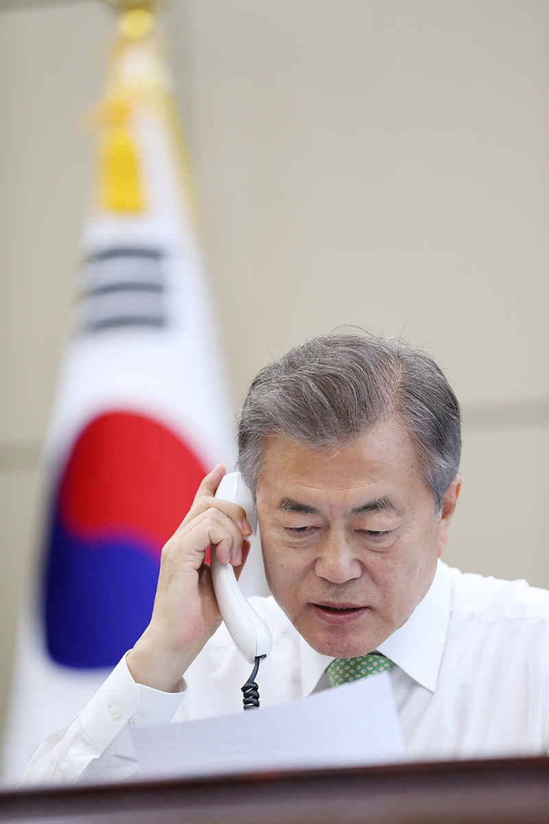 문재인 대통령이 4일 오후 시진핑 중국 국가주석과 전화통화를 하고 있다. 문 대통령은 이날 오후 5시부터 35분간 시진핑 주석과 남북정상회담 결과를 설명하고 의견을 나눴다. 청와대는 "양 정상이 종전선언과 정전협정을 평화협정으로 전환하는 과정에서 긴밀히 소통하고 적극적으로 협력해나가기로 했다"고 전했다. 2018.05.04 사진 청와대제공 |
