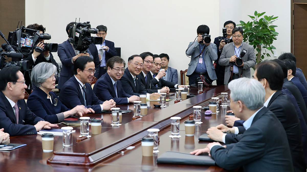 임종석 비서실장이 3일 청와대 여민관에서 열린 판문점선언 이행 추진위원회 제1차 회의를 주재하고 있다. 정부는 판문점선언 이행 추진위원회를 통해 분야별로 후속조치 계획을 수립해 단기 사항은 즉시 착수하고, 중장기 사항은 '남북관계발전기본계획'에 반영해 국회 보고 후 추진한다는 계획이다. 2018.05.03 사진 청와대제공 |