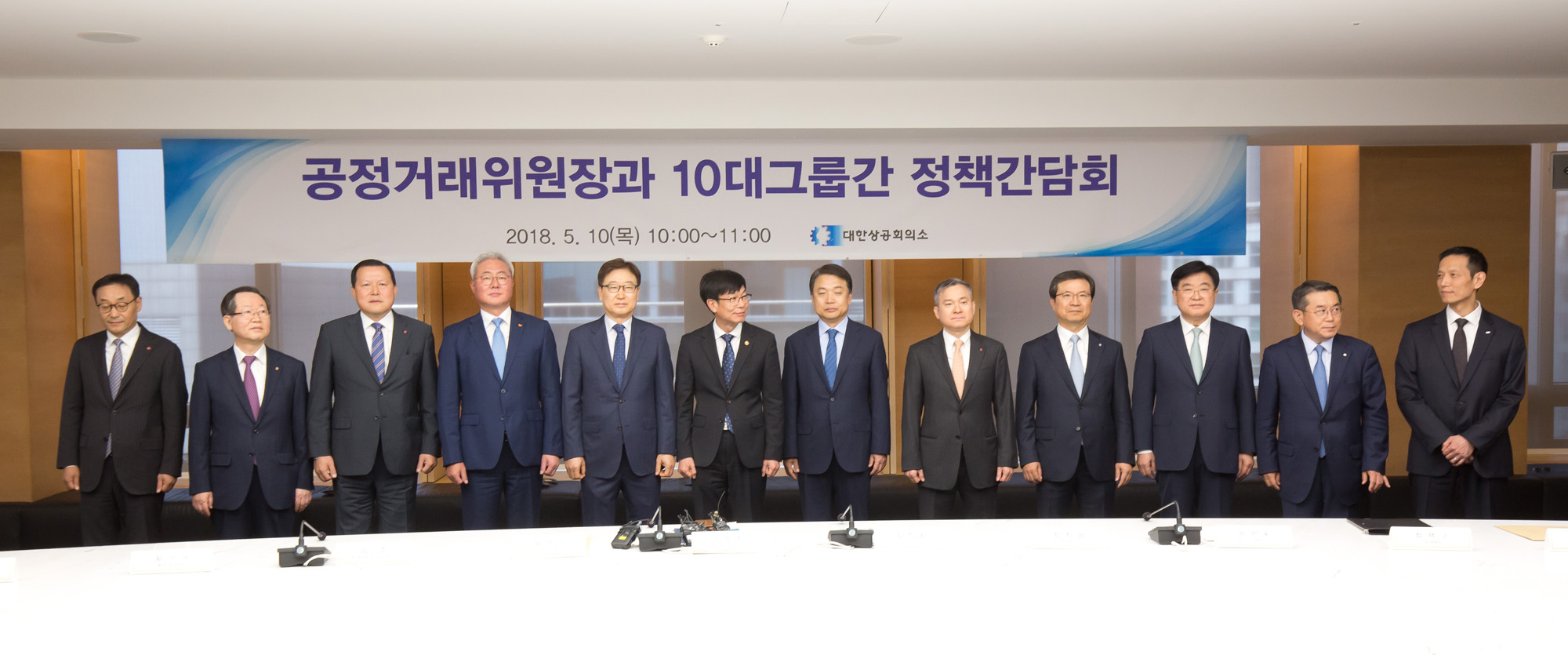 [서울=eoimage] (이오이미지) 임준선 기자 =김상조 공정거래위원장, 김준동 대한상공회의소 상근부회장과 10대 그룹 전문경영인들이 10일 오전 서울 남대문로 대한상공회의소 체임버 라운지에서 열린 정책간담회를 하고 있다. 2018.05.10