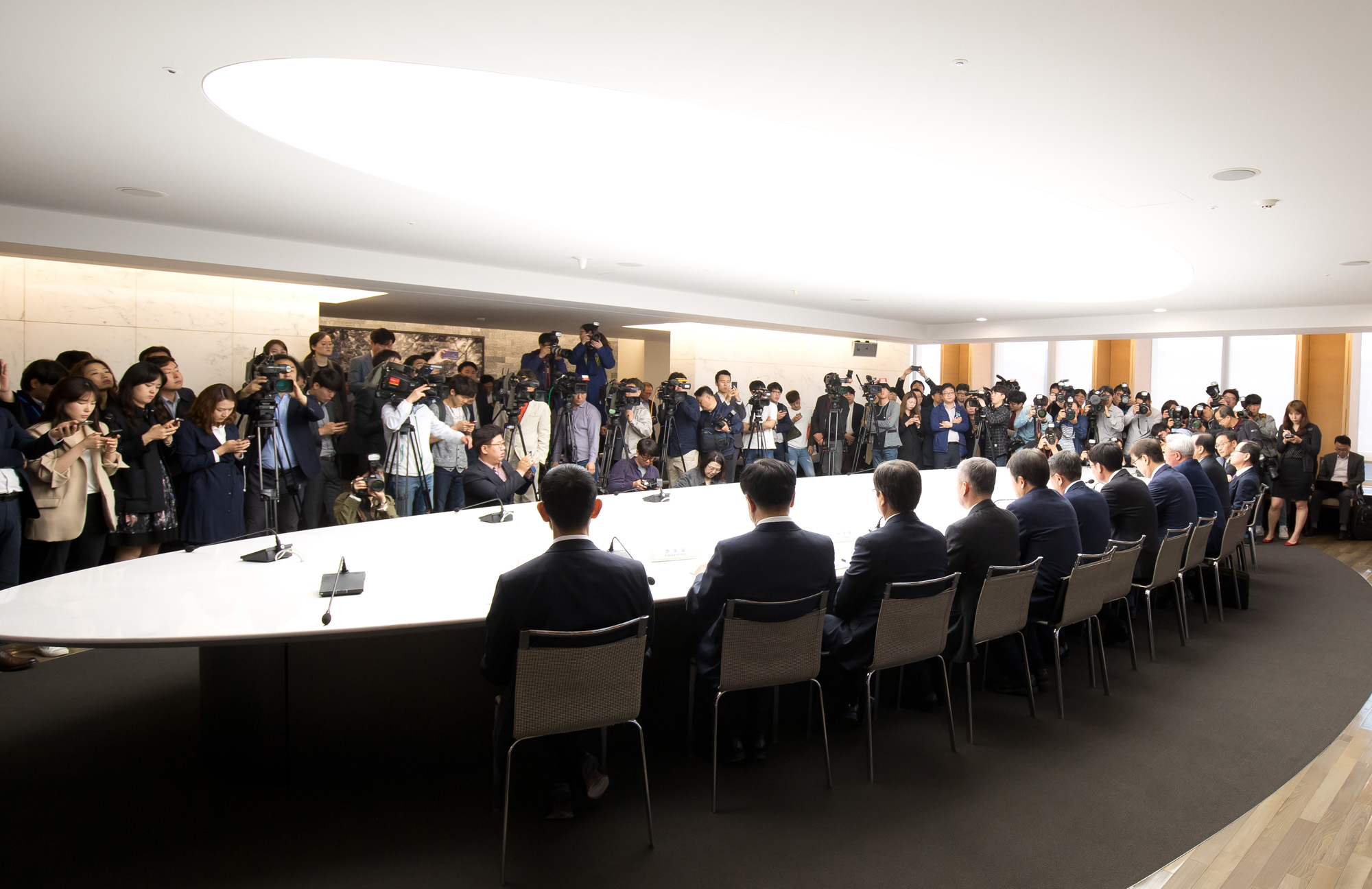 [서울=eoimage] (이오이미지) 임준선 기자 =김상조 공정거래위원장, 김준동 대한상공회의소 상근부회장과 10대 그룹 전문경영인들이 10일 오전 서울 남대문로 대한상공회의소 체임버 라운지에서 열린 정책간담회를 하고 있다. 2018.05.10