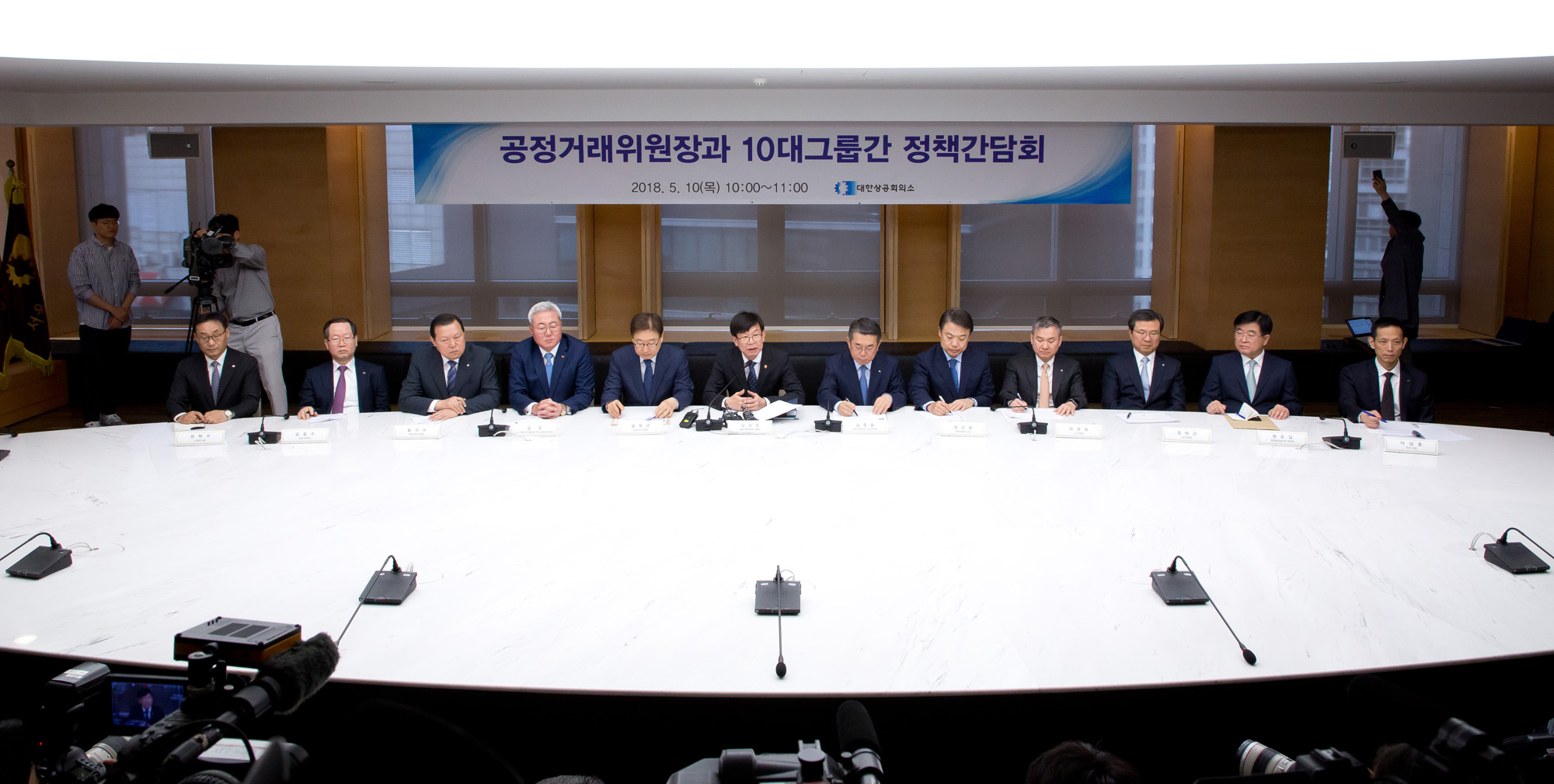[서울=eoimage] (이오이미지) 임준선 기자 =김상조 공정거래위원장, 김준동 대한상공회의소 상근부회장과 10대 그룹 전문경영인들이 10일 오전 서울 남대문로 대한상공회의소 체임버 라운지에서 열린 정책간담회를 하고 있다. 2018.05.10