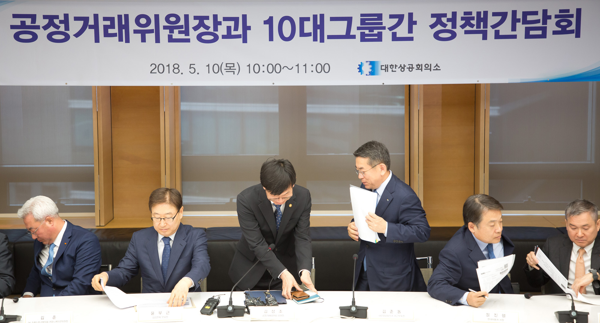 [서울=eoimage] (이오이미지) 임준선 기자 =김상조 공정거래위원장, 김준동 대한상공회의소 상근부회장과 10대 그룹 전문경영인들이 10일 오전 서울 남대문로 대한상공회의소 체임버 라운지에서 열린 정책간담회를 하고 있다. 2018.05.10
