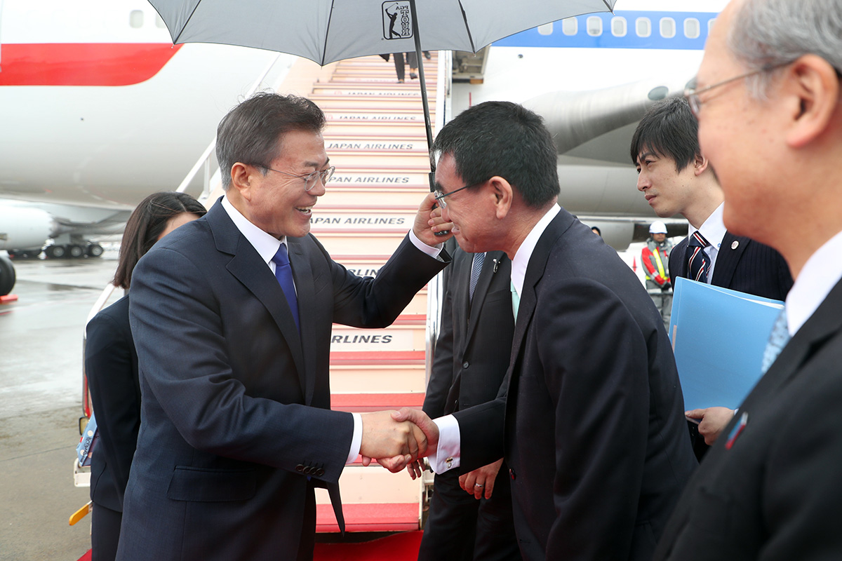 문재인 대통령이 9일 오전(현지시간) 일본 하네다 공항에 도착해 전용기에서 내리고 있다. 문 대통령은 도쿄 아카사카 영빈관에서 열리는 아베 신조 일본 총리, 리커창 중국 총리와 제7차 한·중·일 정상회의에 참석하기 위해 일본을 방문했다.
