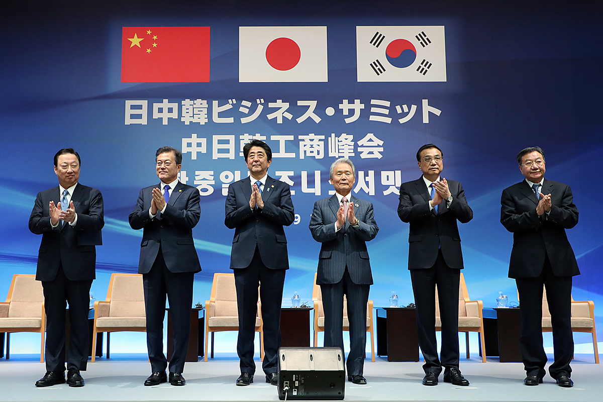 문재인 대통령과 아베 신조 일본 총리, 리커창 중국 국무원 총리가 9일 오전 일본 도쿄 게이단렌(일본경제단체연합)에서 열린 한·일·중 비즈니스 서밋에서 박수치고 있다.
