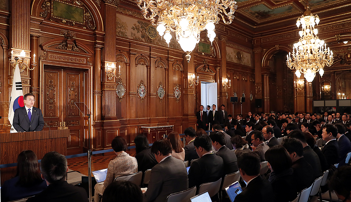 문재인 대통령과 아베 신조 일본 총리, 리커창 중국 국무원 총리가 9일 오전 일본 도쿄 영빈관 '카초노마'에서 제7차 한·일·중 정상회의 공동언론문 발표를 하고 있다. 2018.5.9.