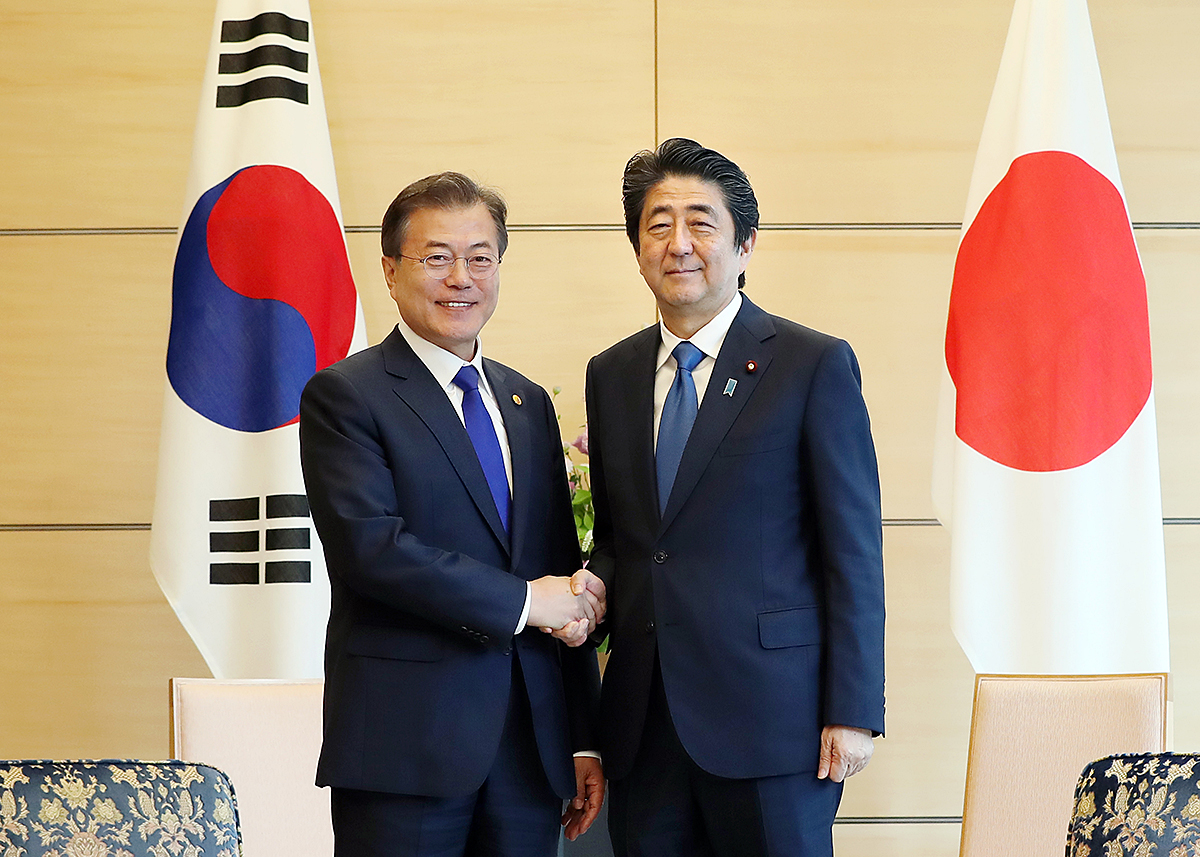 문재인 대통령과 아베 신조 일본 총리가 9일 오후 일본 도쿄 모토아카사카 총리관저에서 한-일 확대정상회담에 앞서 악수하고 있다.