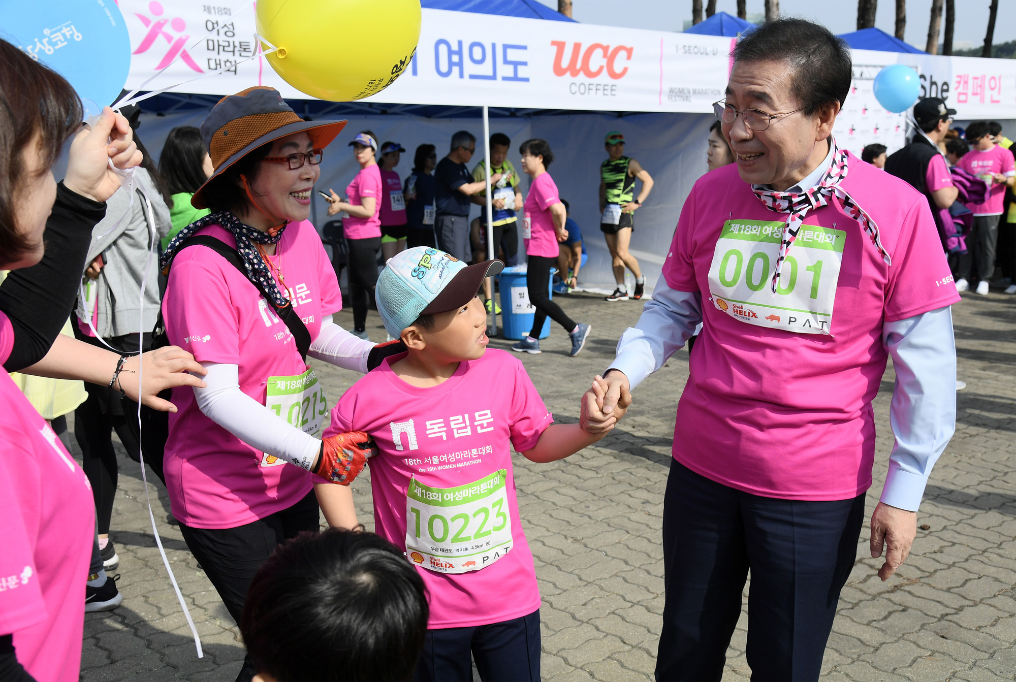 박원순 서울시장이 5일 오전 서울 마포구 월드컵공원에서 열린 제18회 여성마라톤대회에 참석하고 있다. 서울시 제공