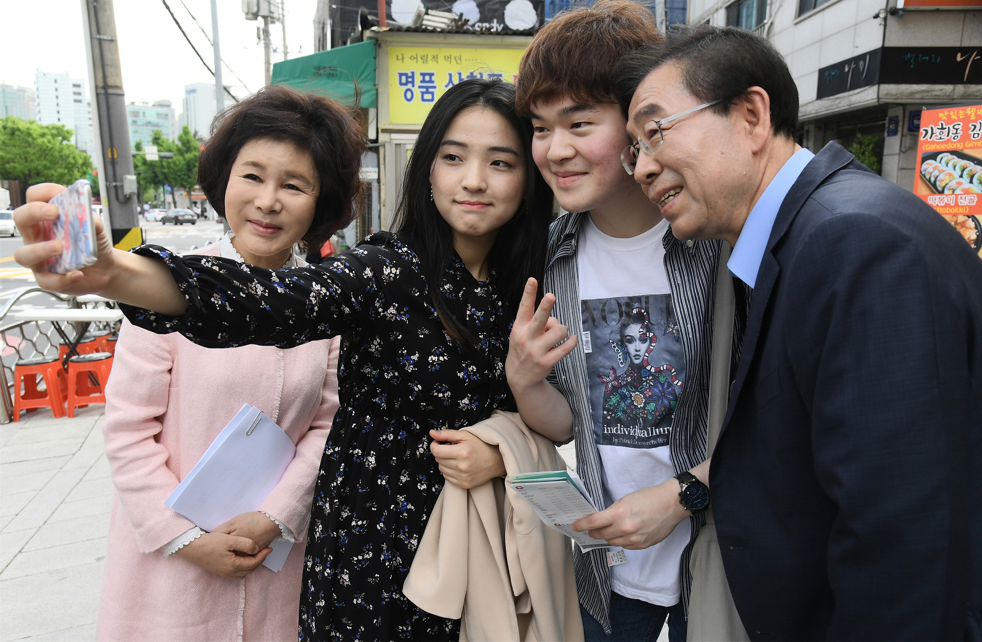 박원순 서울시장과 부인 강난희 여사가 어버이날을 하루 앞둔 7일 오후 서울 종로구 가회경로당을 방문해 어르신들에게 큰절을 하고 있다. 서울시 제공