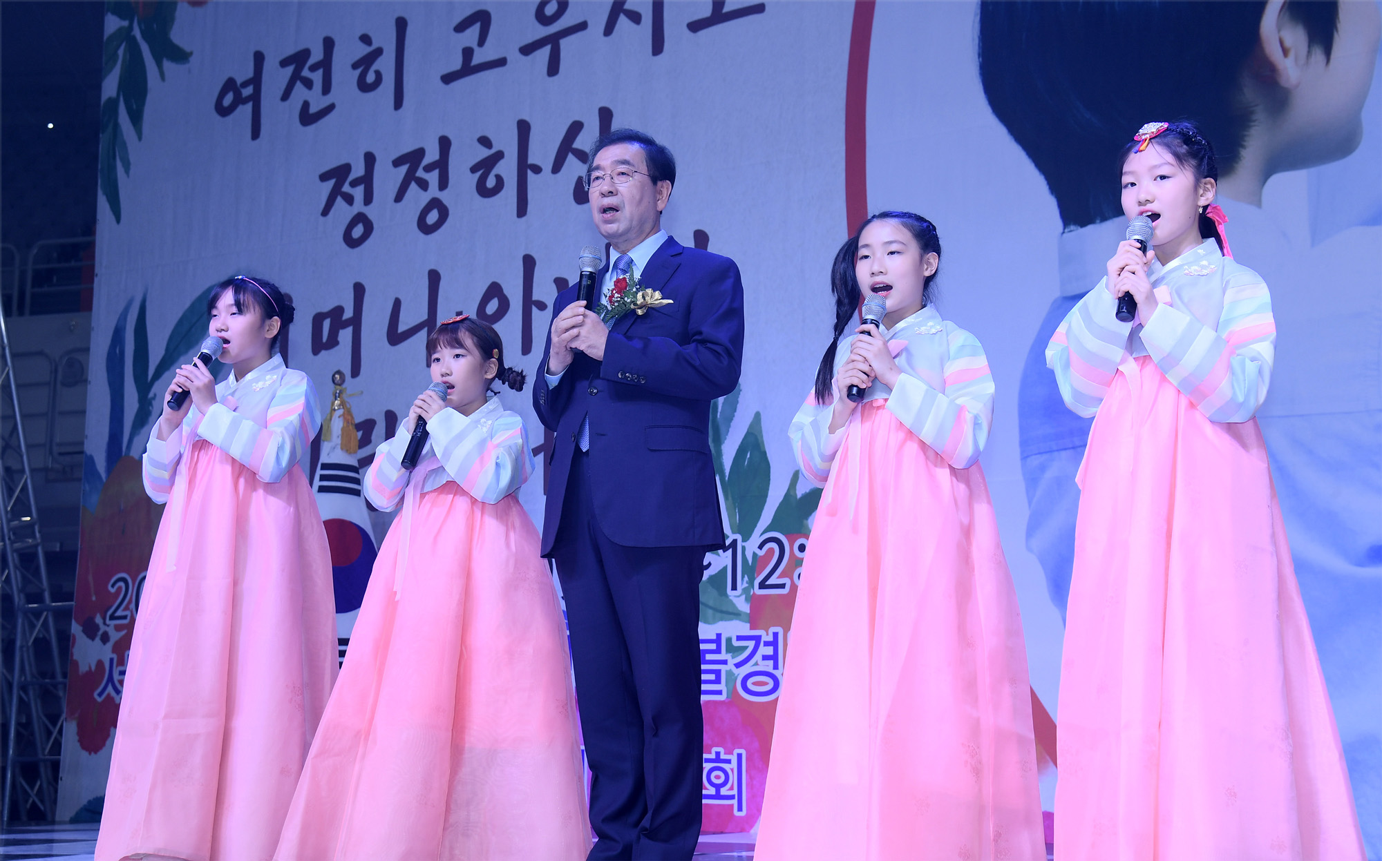 박원순 서울시장을 비롯한 주요 내빈들이 8일 서울 송파구 올림픽공원 SK핸드볼경기장에서 열린 '어버이날 기념식'에 참석하고 있다. 서울시 제공
