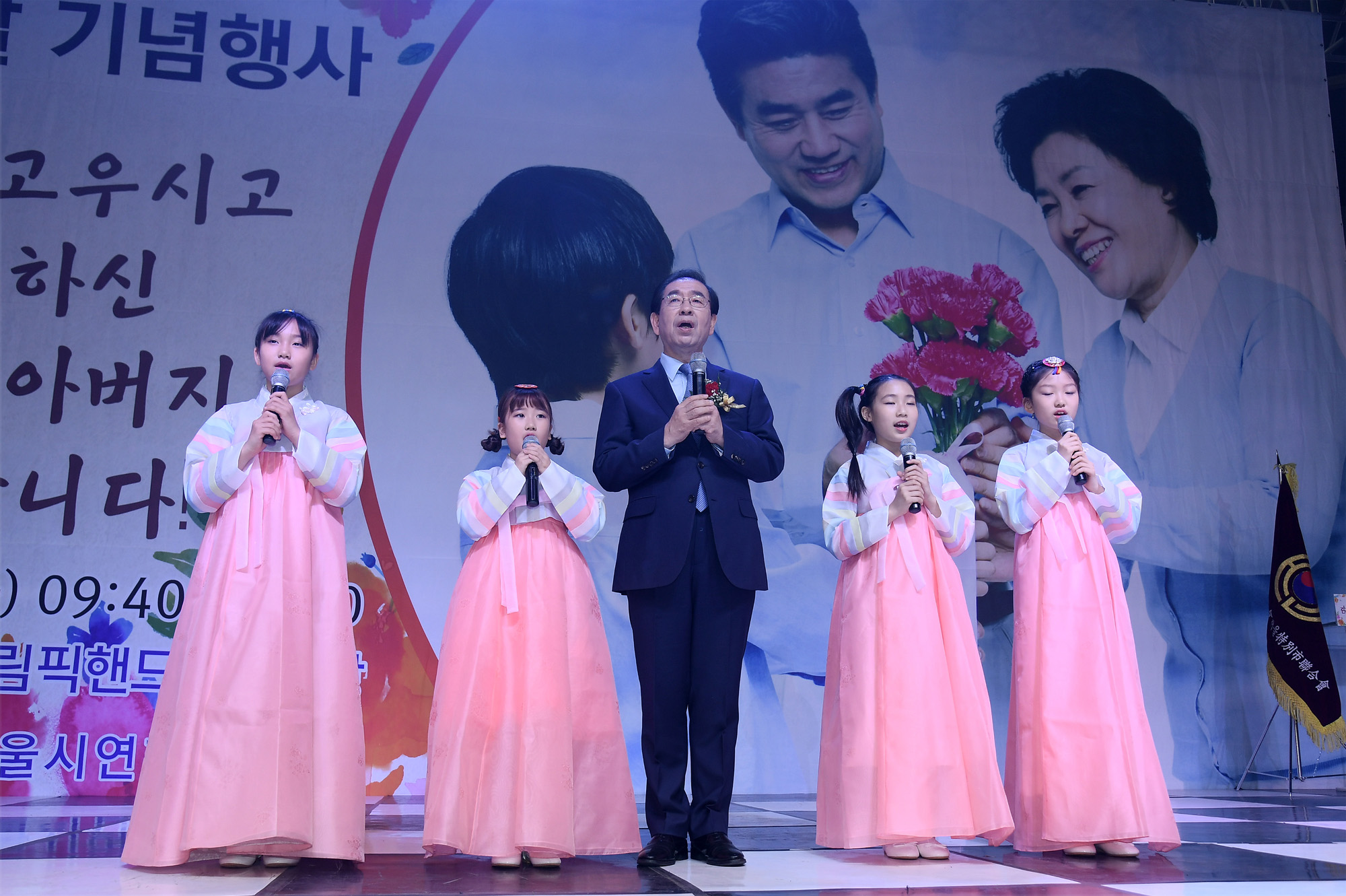 박원순 서울시장을 비롯한 주요 내빈들이 8일 서울 송파구 올림픽공원 SK핸드볼경기장에서 열린 '어버이날 기념식'에 참석하고 있다. 서울시 제공