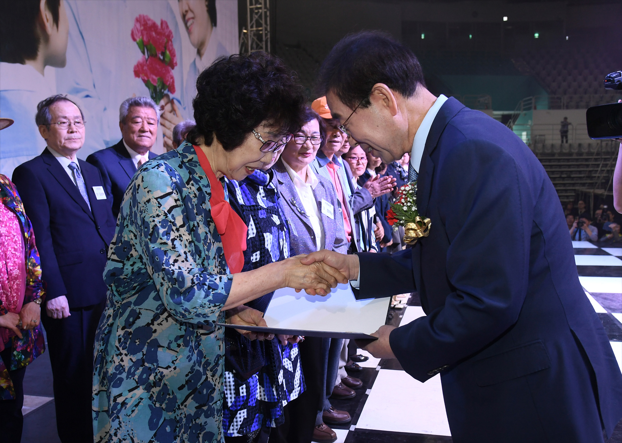 박원순 서울시장을 비롯한 주요 내빈들이 8일 서울 송파구 올림픽공원 SK핸드볼경기장에서 열린 '어버이날 기념식'에 참석하고 있다. 서울시 제공