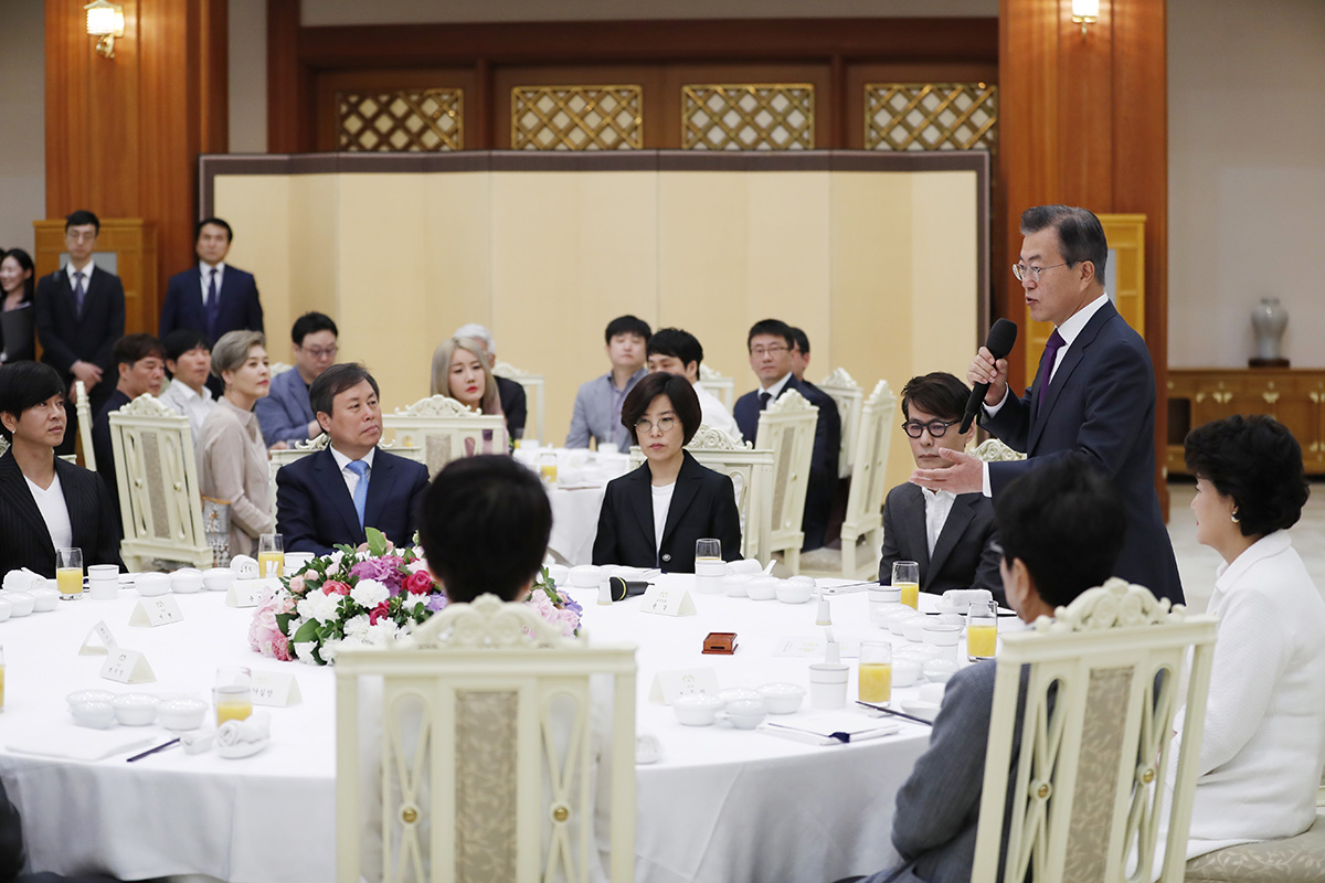 문재인 대통령이 11일 청와대 충무실에서 남북평화 협력기원 남측예술단을 초청해 오찬에 앞서 격려사를 하고 있다.