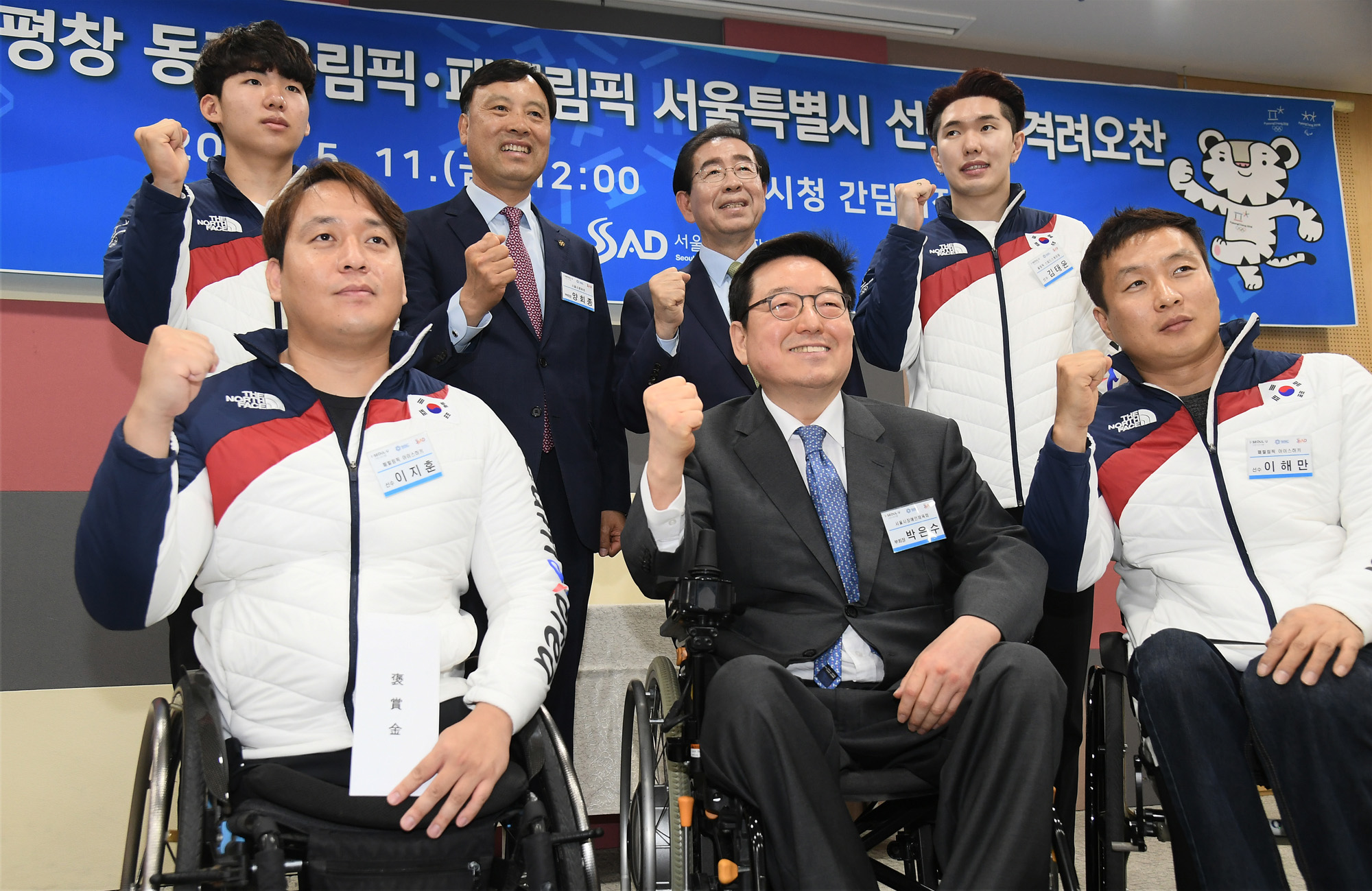 박원순 서울시장이 11일 서울시청 간담회장에서 열린 2018 평창 동계올림픽·패럴림픽 서울특별시 선수단 격려 오찬에서 선수들과 인사를 하고 있다. 서울시 제공