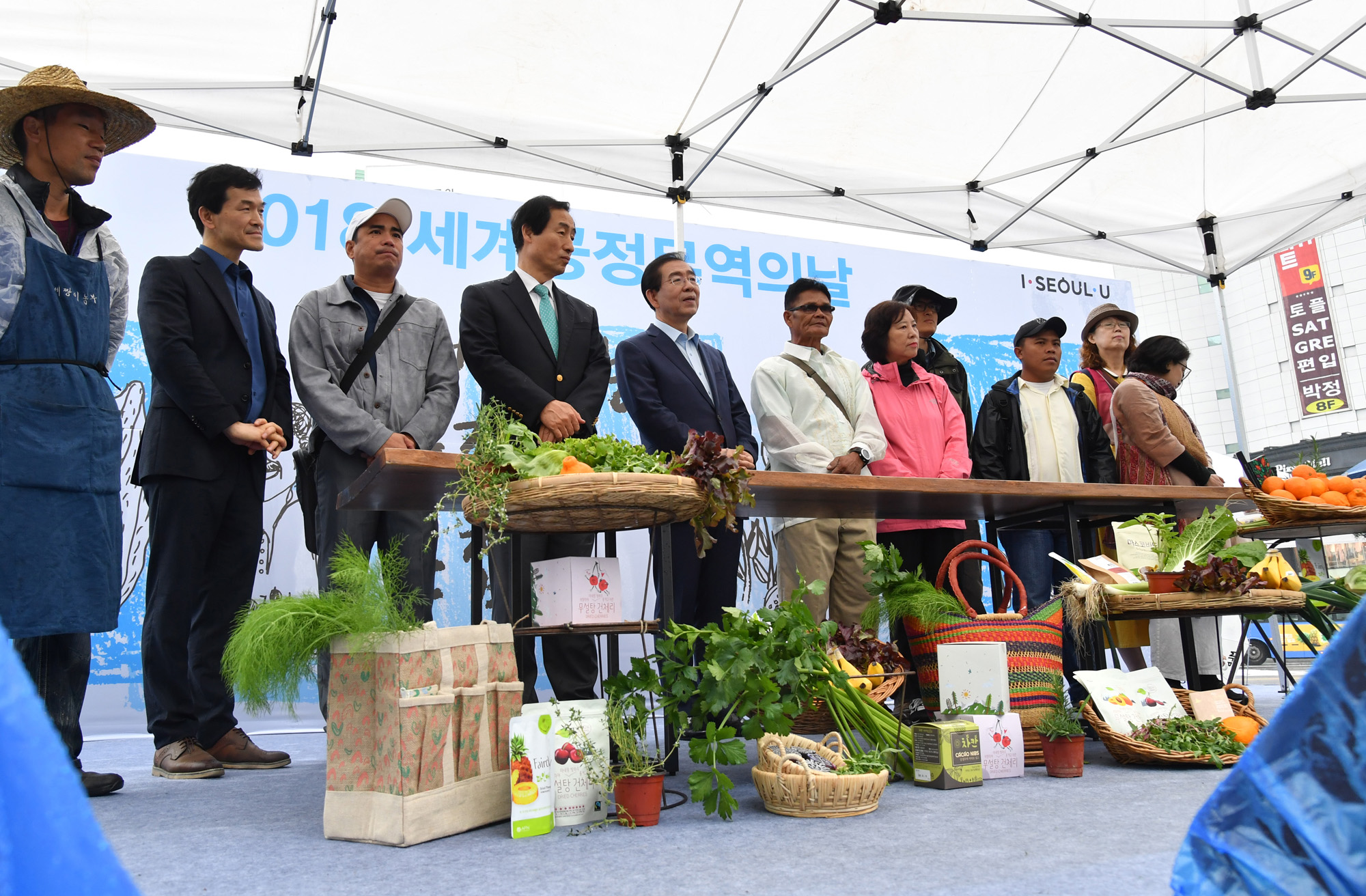 박원순 서울시장이 지난 12일 오전 서울 신촌 연세로에서 열린 2018 세계 공정무역의 날 행사에서 망고 파인애플 등 공정무역 제품과 방울토마토와 같은 국내 재배작물을 대형 접시에 플리이팅 하고 있다. 서울시 제공