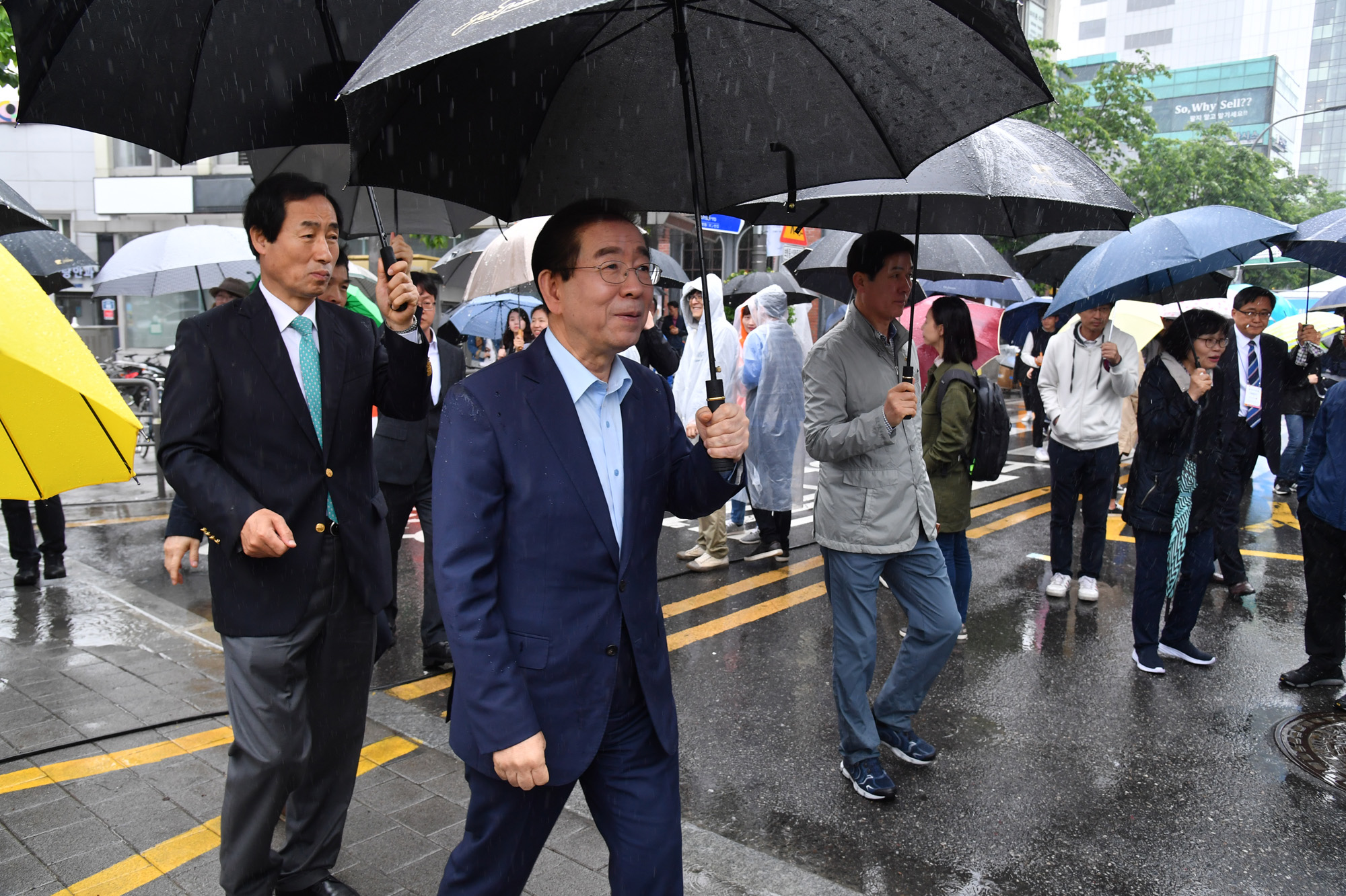 박원순 서울시장이 지난 12일 오전 서울 신촌 연세로에서 열린 2018 세계 공정무역의 날 행사에서 망고 파인애플 등 공정무역 제품과 방울토마토와 같은 국내 재배작물을 대형 접시에 플리이팅 하고 있다. 서울시 제공