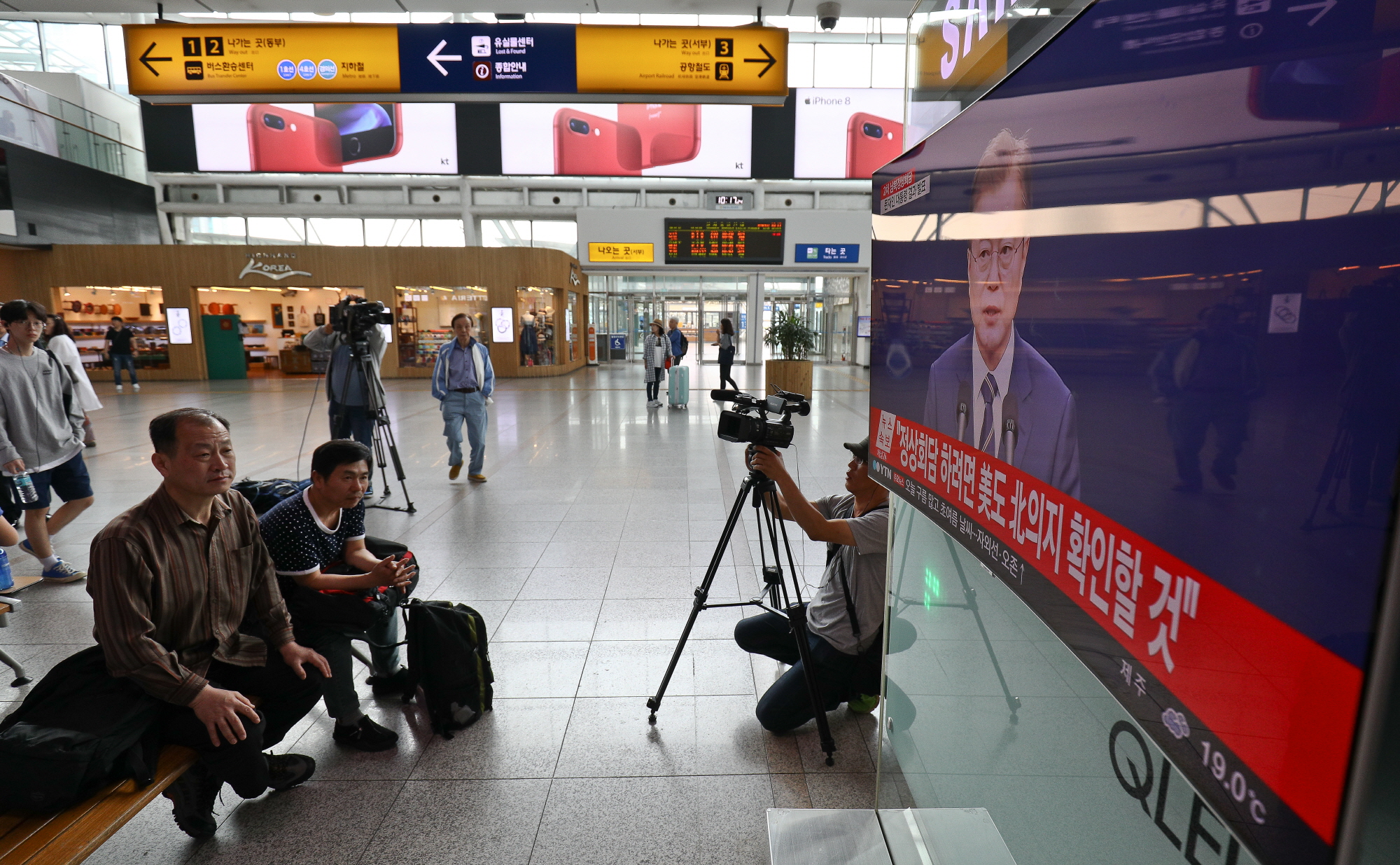 [서울=eoimage] 고성준 기자 = 27일 오전 서울역 대합실에서 시민들이 제2차 남북정상회담 결과발표 속보를 시청하고 있다. 2018.5.27