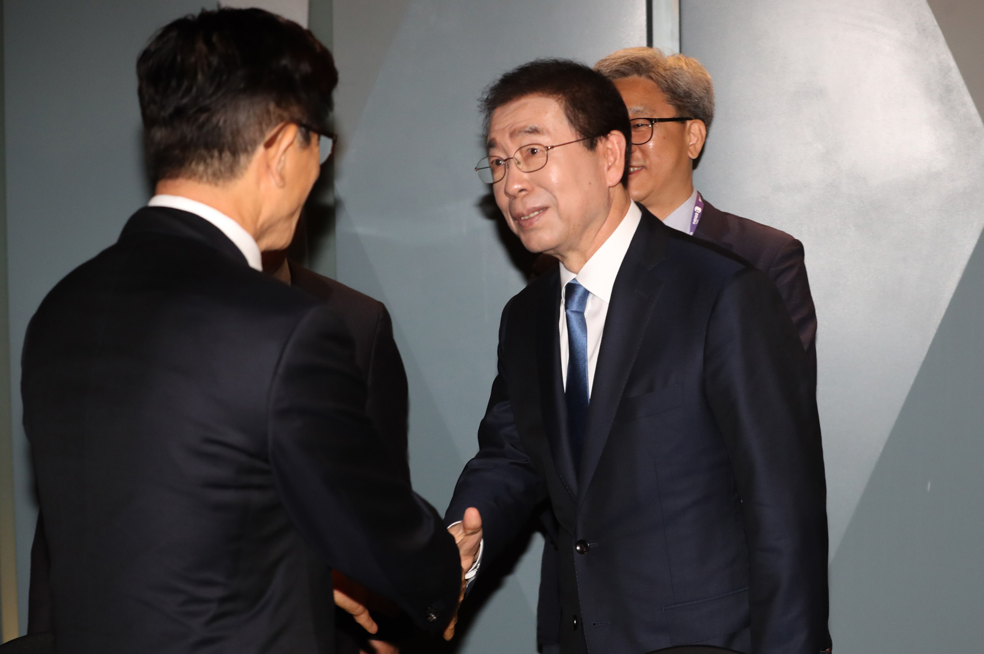 박원순 더불어민주당 서울시장 후보가 30일 오전 서울 중구 플라자 호텔에서 열린 '2018한국미래포럼'에서 김문수 자유한국당 서울시장 후보와 악수를 하고 있다.2018.05.30