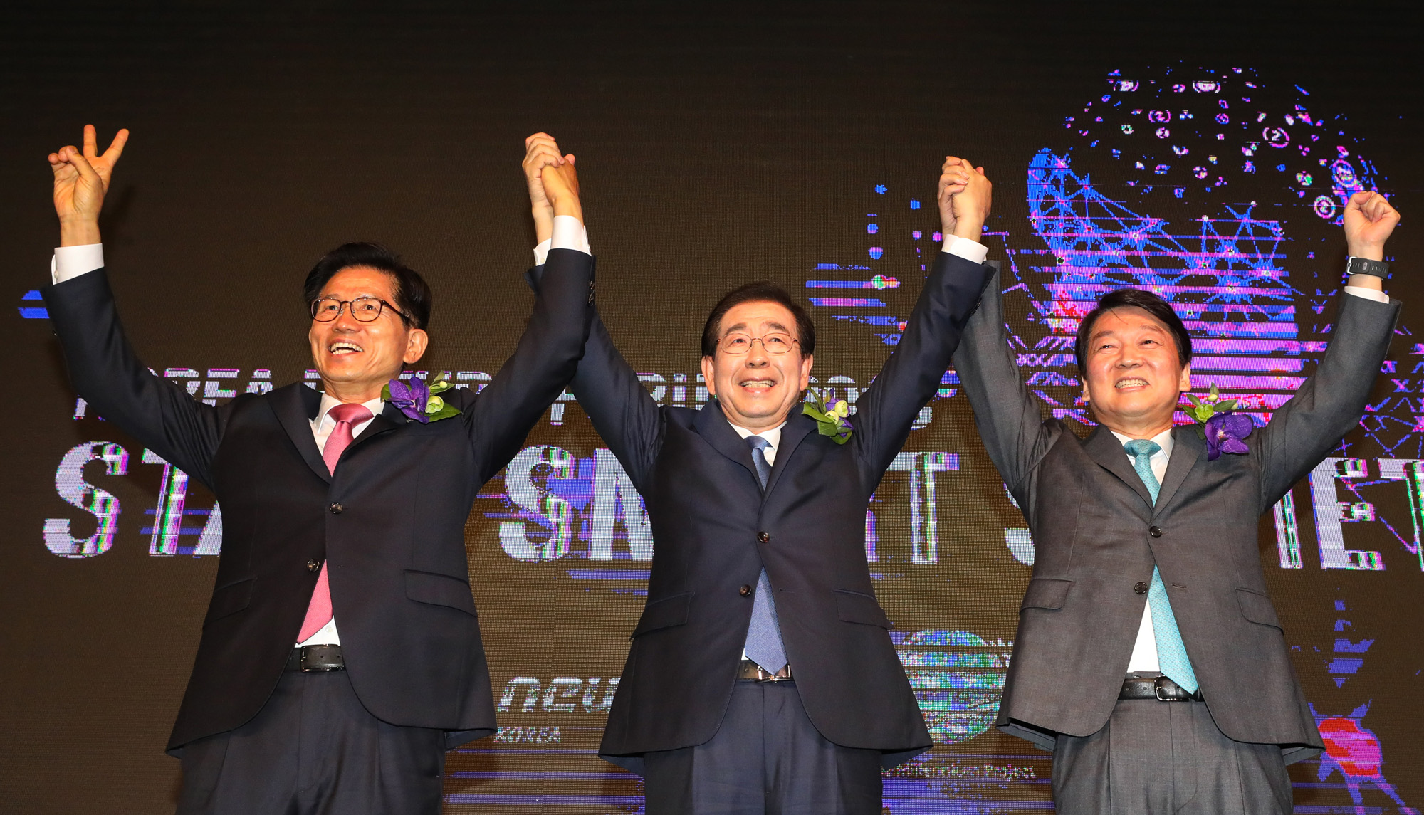 김문수(왼쪽부터) 자유한국당 서울시장 후보, 박원순 더불어민주당 서울시장 후보, 안철수 바른미래당 서울시장 후보가 30일 오전 서울 중구 플라자 호텔에서 열린 '2018한국미래포럼'에서 기념촬영을 하고 있다. 2018.05.30