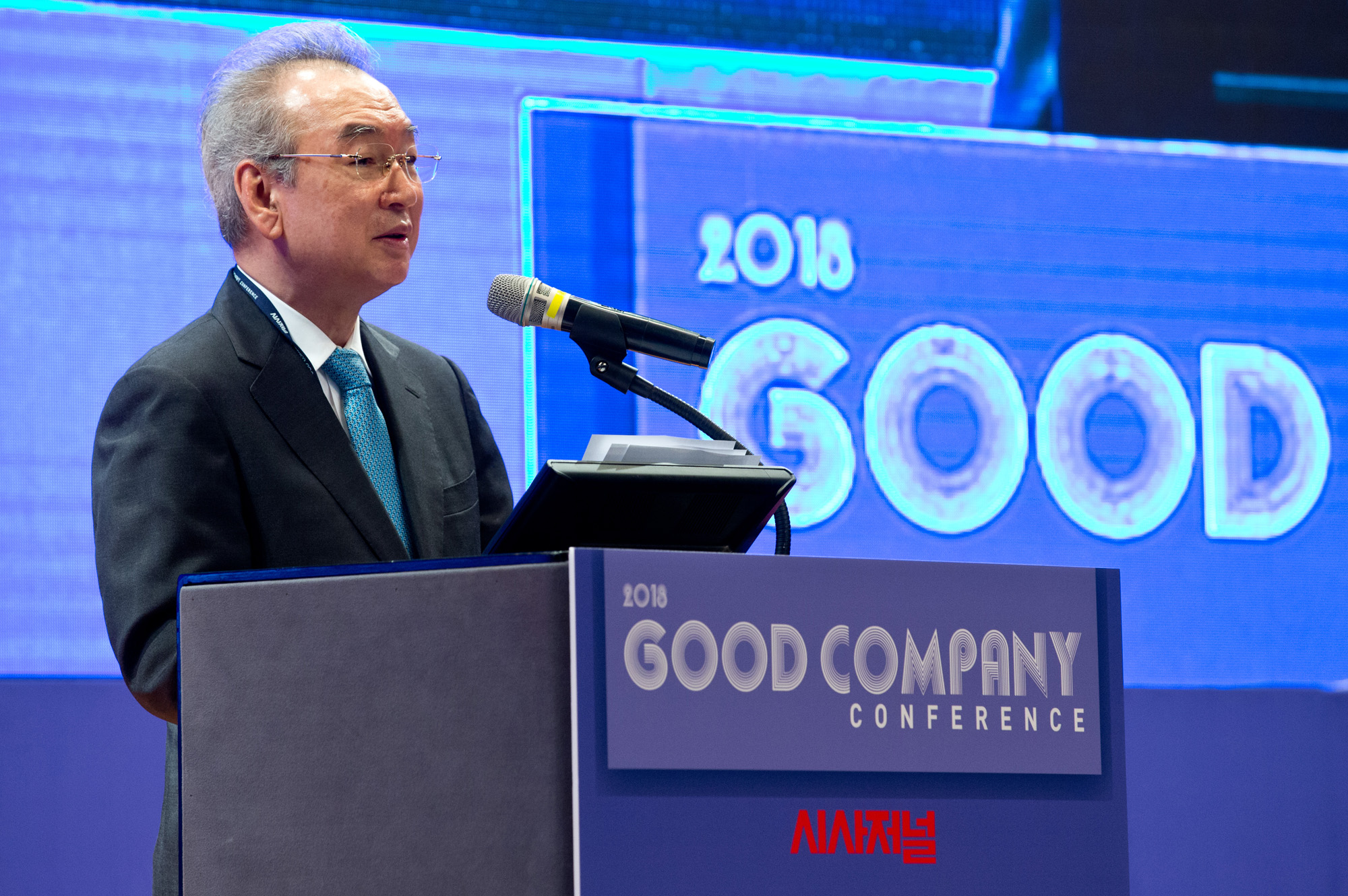 '2018 굿컴퍼니 컨퍼런스(GCC)'에서 박호군 서울벤처대학원 대학교 총장이 축사를 하고 있다.